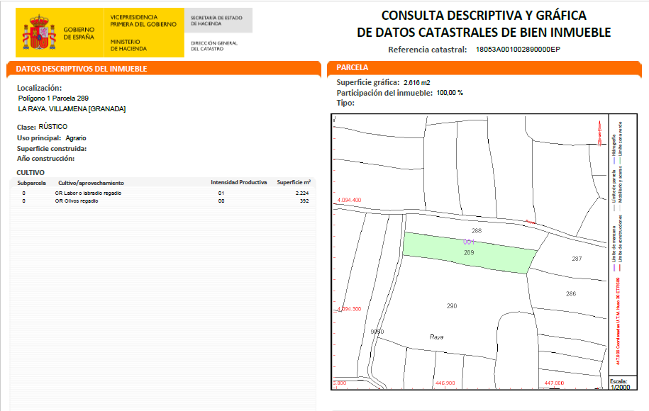 Actualmente cuenta con una plantación de olivos jóvenes en una parte del terreno, mientras que la otra parte permanece valdía, ideal para nuevos cultivos o para destinarla a otros usos agrícolas. Tiene derecho a riego por la acequia.