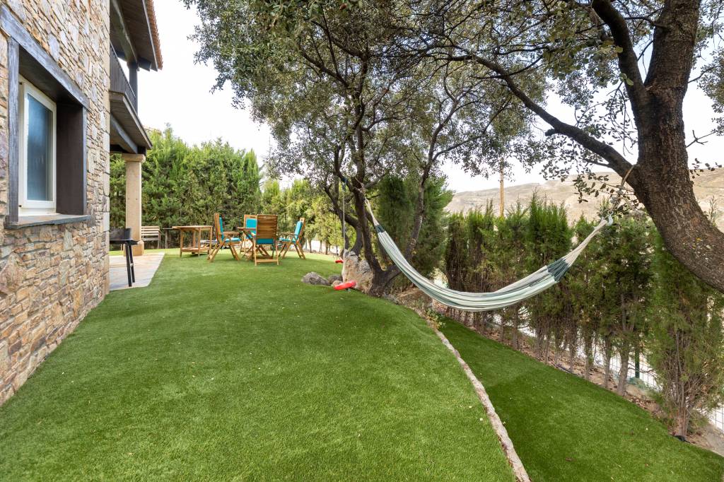 En el exterior, un jardín cuidado con porche invita a vivir al aire libre, leer, o simplemente no hacer nada mientras el sol cruza el valle.