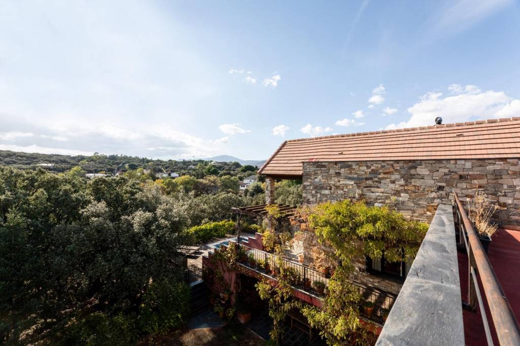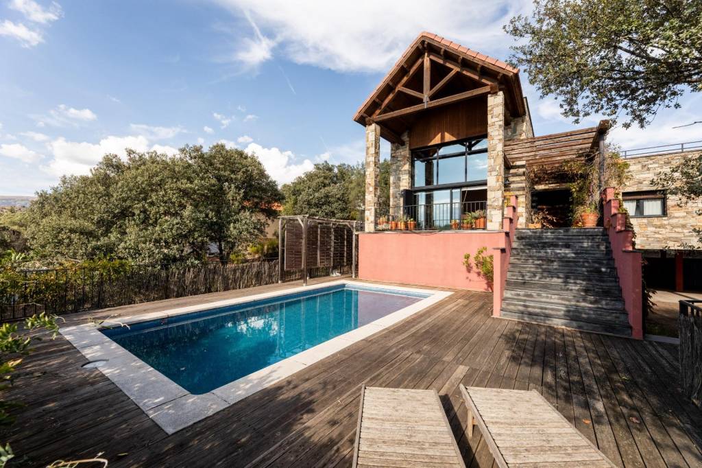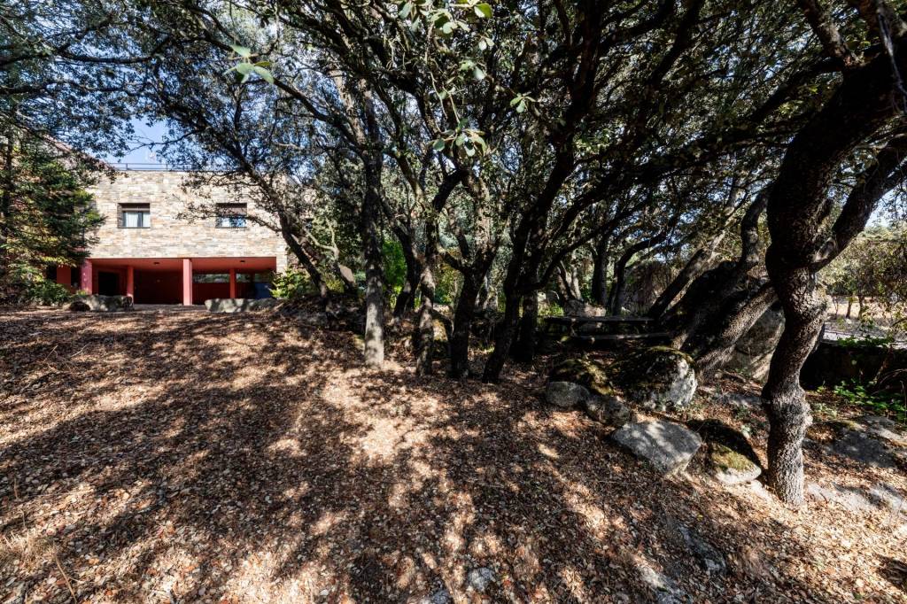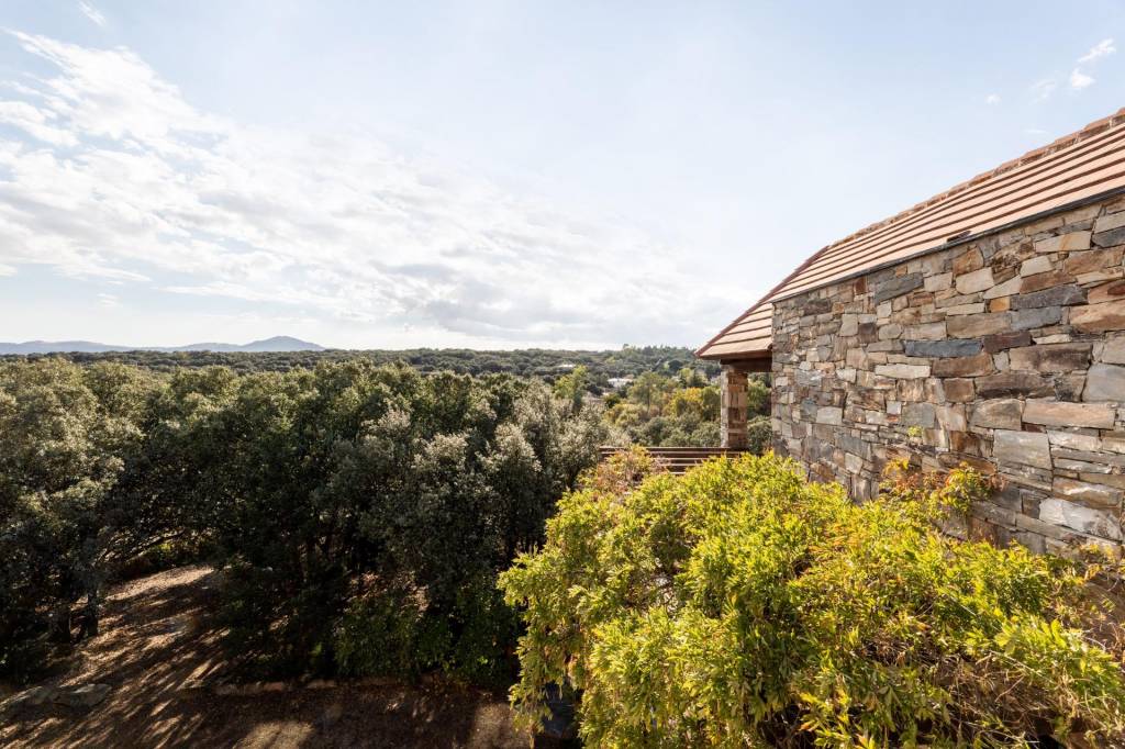 El primer encuentro con la villa revela su carácter único. La fachada, construida con piedra natural maragata ‘a hueso’, es una obra de artesanía que evoca la solidez de las construcciones atemporales. No es una simple elección estética, sino una manifestación de calidad y durabilidad que dialoga a la perfección con el bosque de encinas centenarias y las formaciones graníticas que abrazan la parcela de 1650 m².