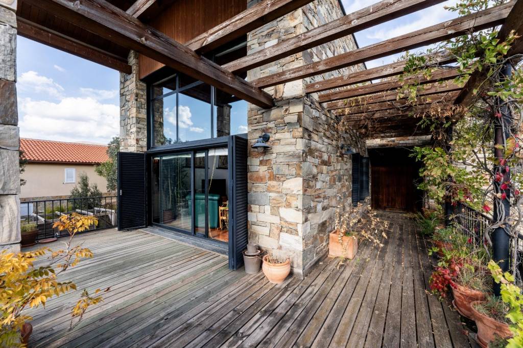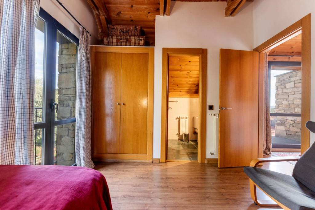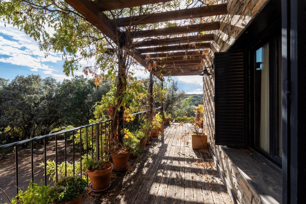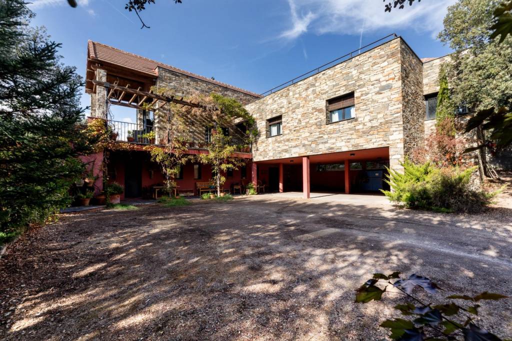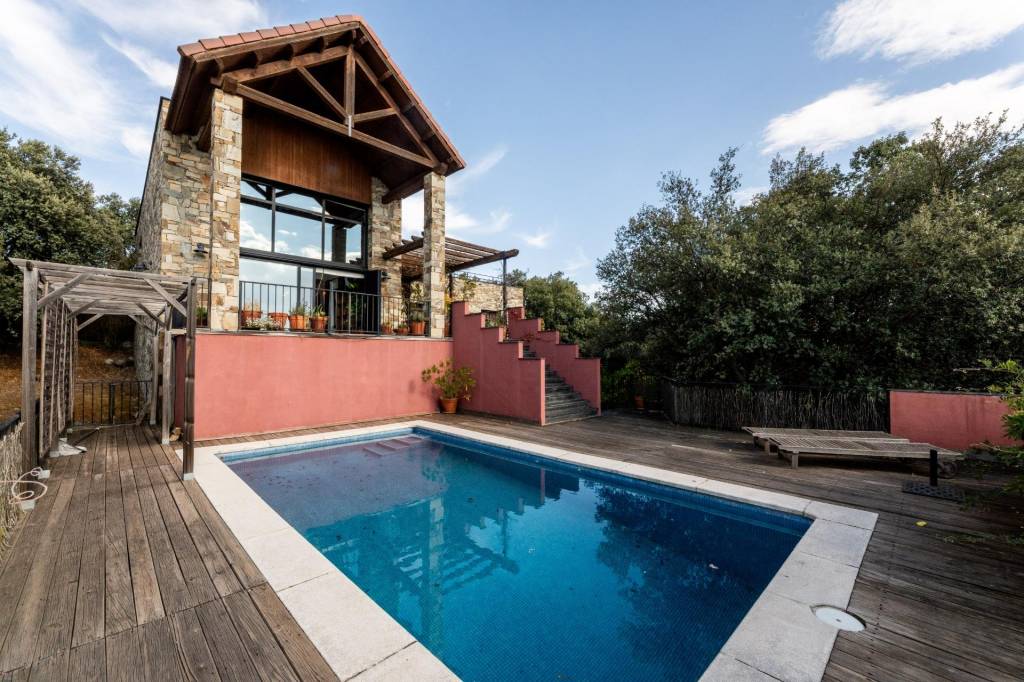 El primer encuentro con la villa revela su carácter único. La fachada, construida con piedra natural maragata ‘a hueso’, es una obra de artesanía que evoca la solidez de las construcciones atemporales. No es una simple elección estética, sino una manifestación de calidad y durabilidad que dialoga a la perfección con el bosque de encinas centenarias y las formaciones graníticas que abrazan la parcela de 1650 m².