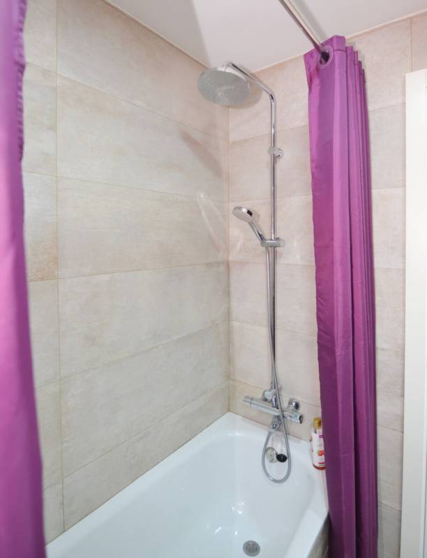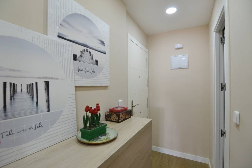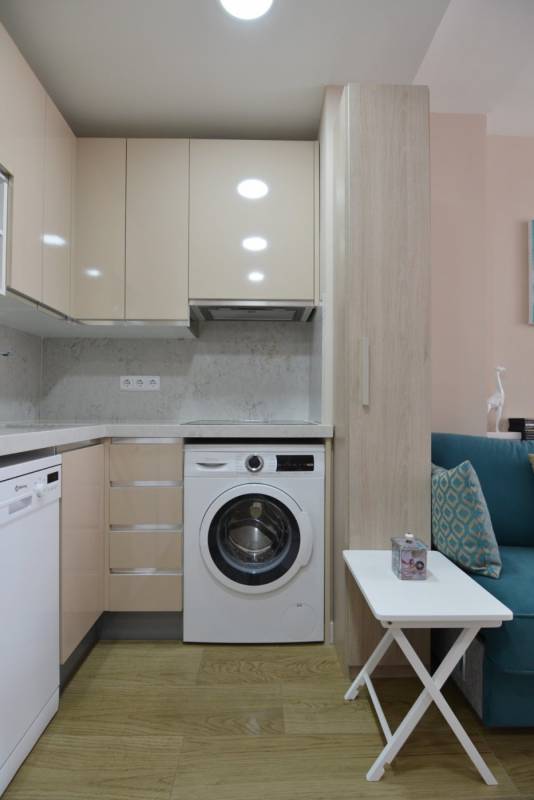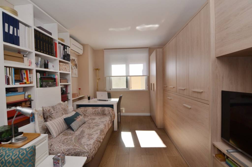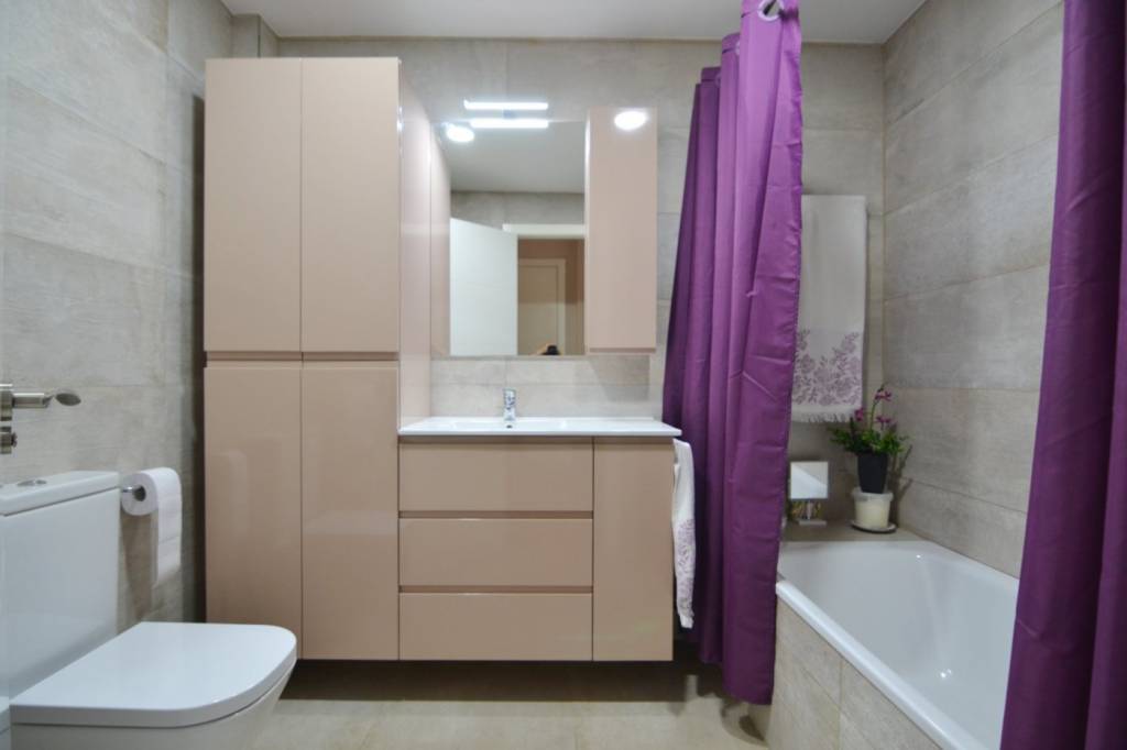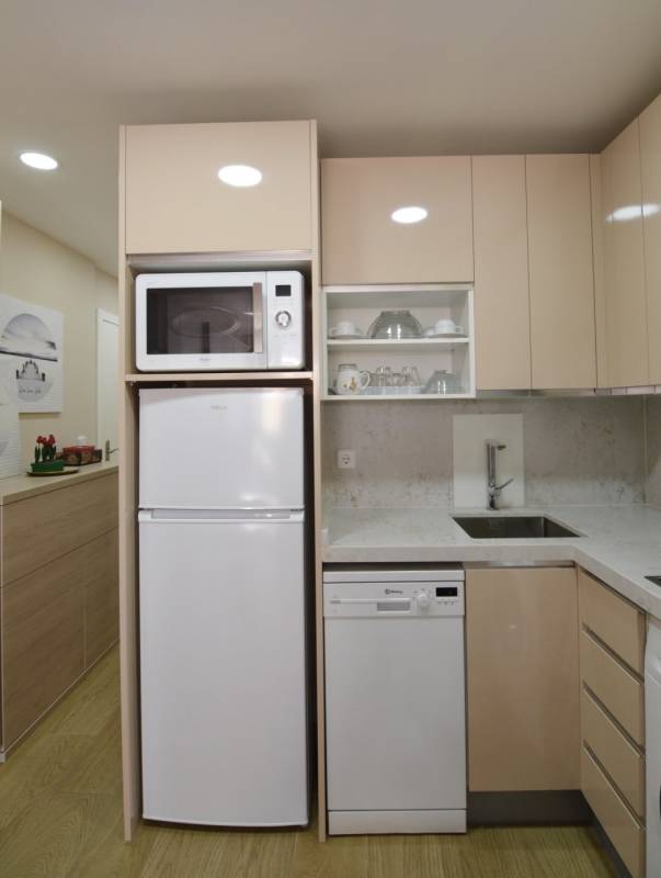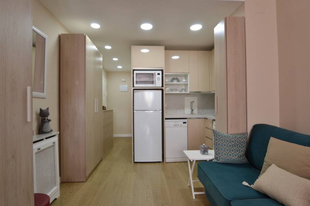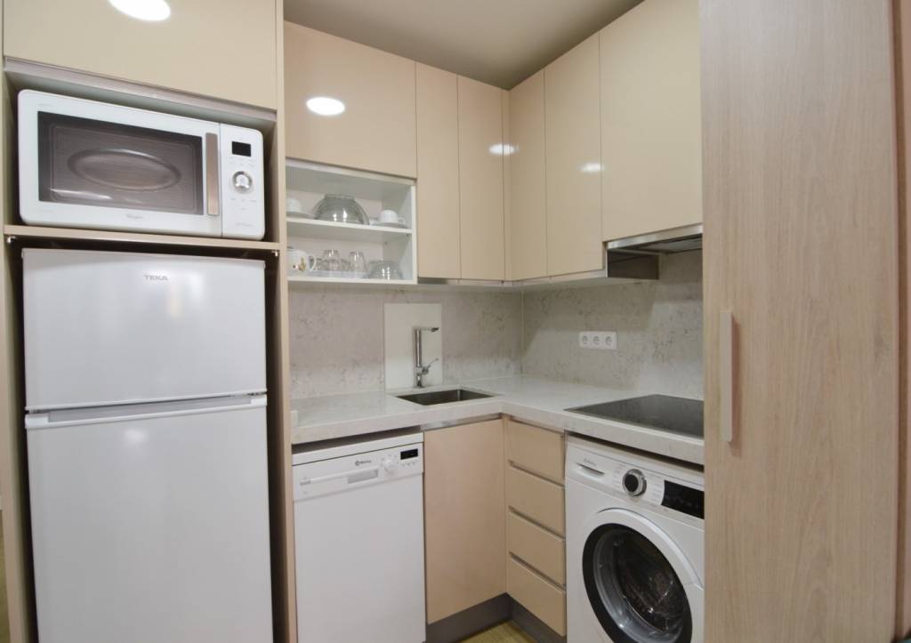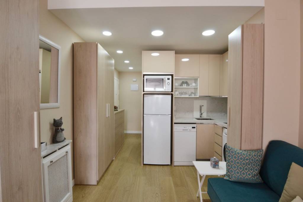 La vivienda presenta una distribución funcional. Frente a la puerta de entrada se encuentra un amplio baño completo: inodoro con ducha higiénica a la izquierda, frontal de muebles a medida (armario con gran fondo, lavabo con cajonera y columna) y bañera grande a la derecha. Continuando por el pasillo distribuidor, que cuenta con un mueble aparador y armario alto, se sitúa la cocina con muebles a medida, amplio fregadero, lavadora, lavavajillas, frigorífico de altura media, microondas grande con horno, campana con altísimo poder de extracción y placa de 5 fuegos (uno de ellos de 28 cm). En el espacio principal se ubican un moderno sofá/cama, una cama de 90 con canapé de gran capacidad, otra cama de 90 plegable, una estantería hecha a medida, una mesa de 80 por 120 con 2 sillas, un armario y varios muebles de almacenaje, incluyendo mueble a medida para la TV y 2 columnas despensero.