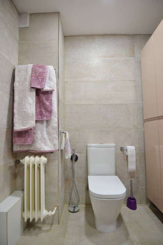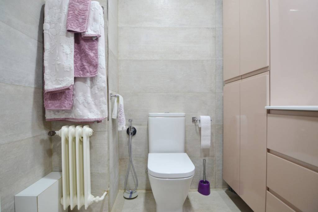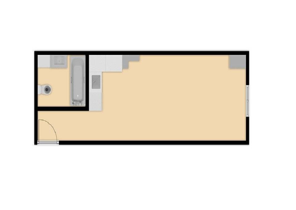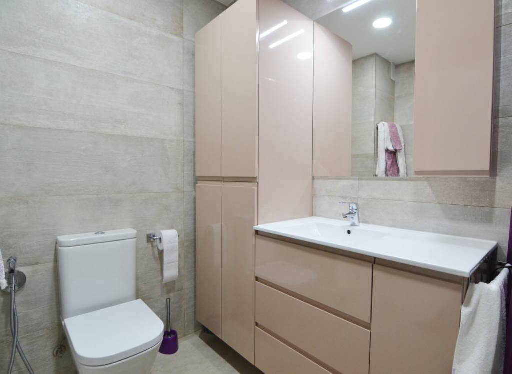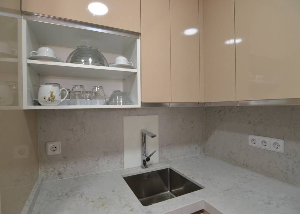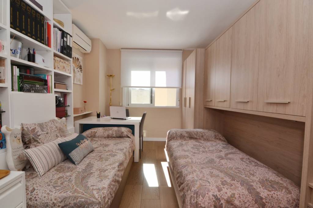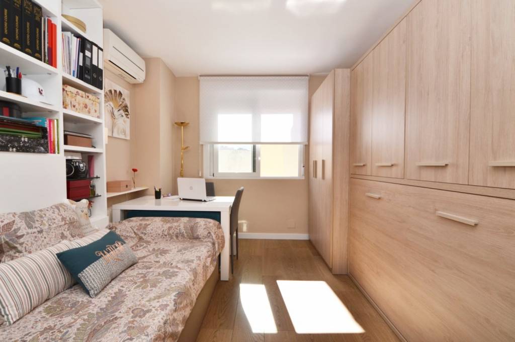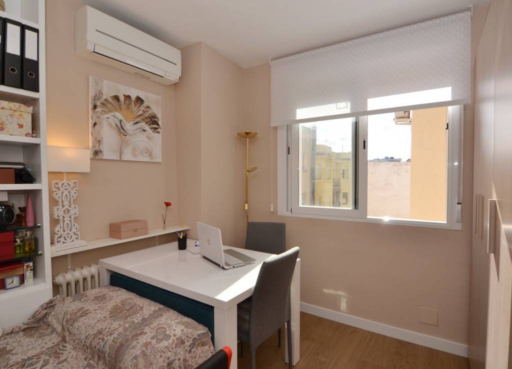 La vivienda presenta una distribución funcional. Frente a la puerta de entrada se encuentra un amplio baño completo: inodoro con ducha higiénica a la izquierda, frontal de muebles a medida (armario con gran fondo, lavabo con cajonera y columna) y bañera grande a la derecha. Continuando por el pasillo distribuidor, que cuenta con un mueble aparador y armario alto, se sitúa la cocina con muebles a medida, amplio fregadero, lavadora, lavavajillas, frigorífico de altura media, microondas grande con horno, campana con altísimo poder de extracción y placa de 5 fuegos (uno de ellos de 28 cm). En el espacio principal se ubican un moderno sofá/cama, una cama de 90 con canapé de gran capacidad, otra cama de 90 plegable, una estantería hecha a medida, una mesa de 80 por 120 con 2 sillas, un armario y varios muebles de almacenaje, incluyendo mueble a medida para la TV y 2 columnas despensero.