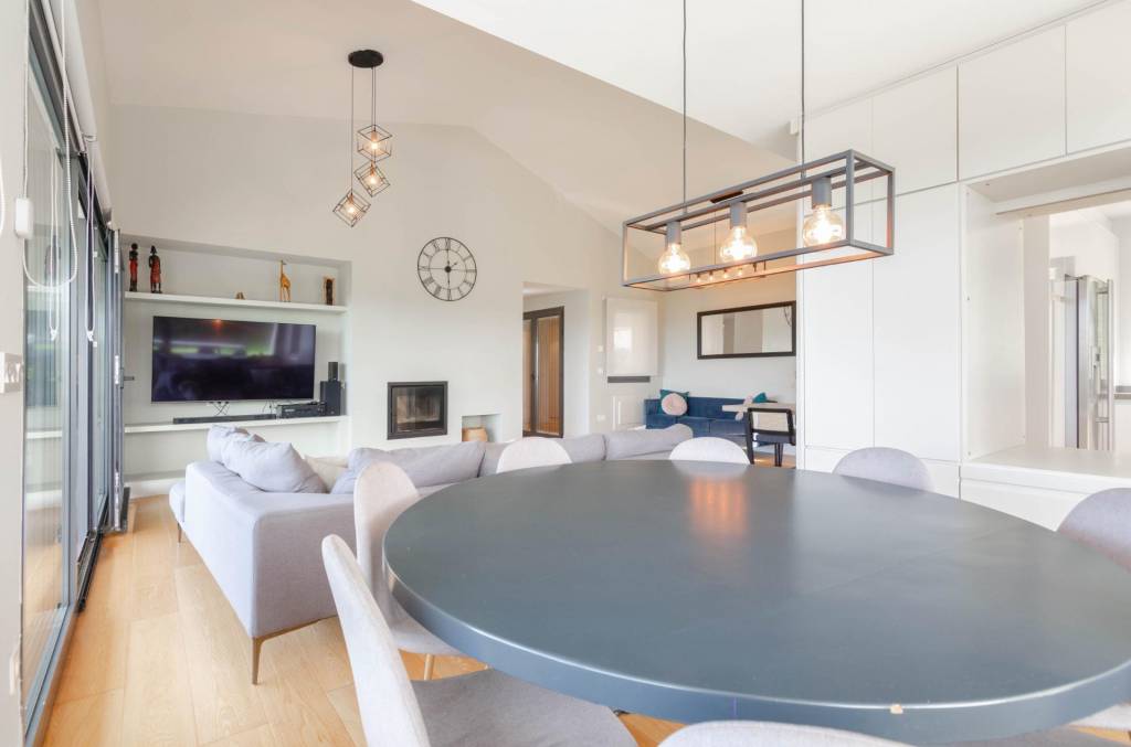 • Amplio salón-comedor con chimenea y salida directa a la terraza perimetral acristalada, que enmarca unas vistas impresionantes a la ciudad de Gijón.