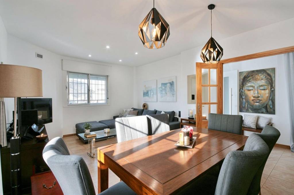 El salón principal se integra de forma natural con la terraza y la piscina privada, generando continuidad visual y una agradable sensación de amplitud. La orientación de la vivienda y los grandes ventanales potencian la luminosidad y el confort térmico.