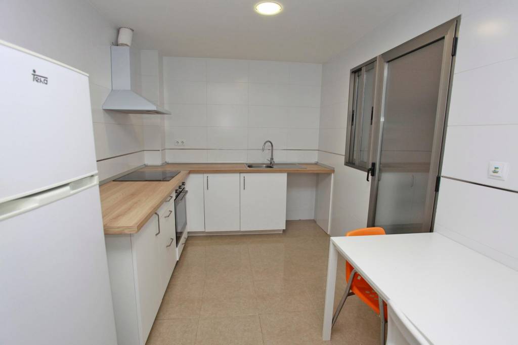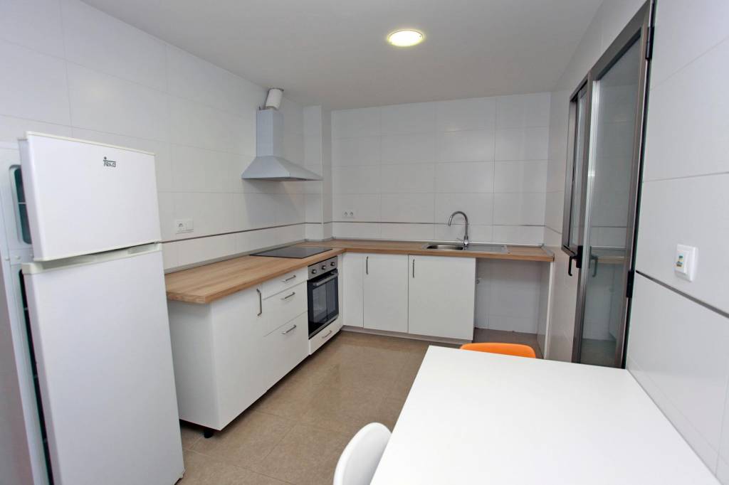 La cocina está completamente equipada, integrada en un diseño cerámico contemporáneo e incluye electrodomésticos como frigorífico y horno, lista para usar desde el primer día.