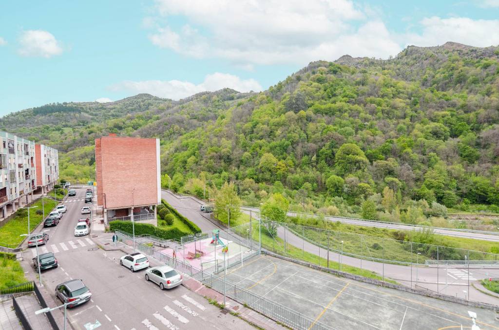 Parque infantil, pista de juegos, zonas ajardinadas y vistas a la montaña sobre el río.