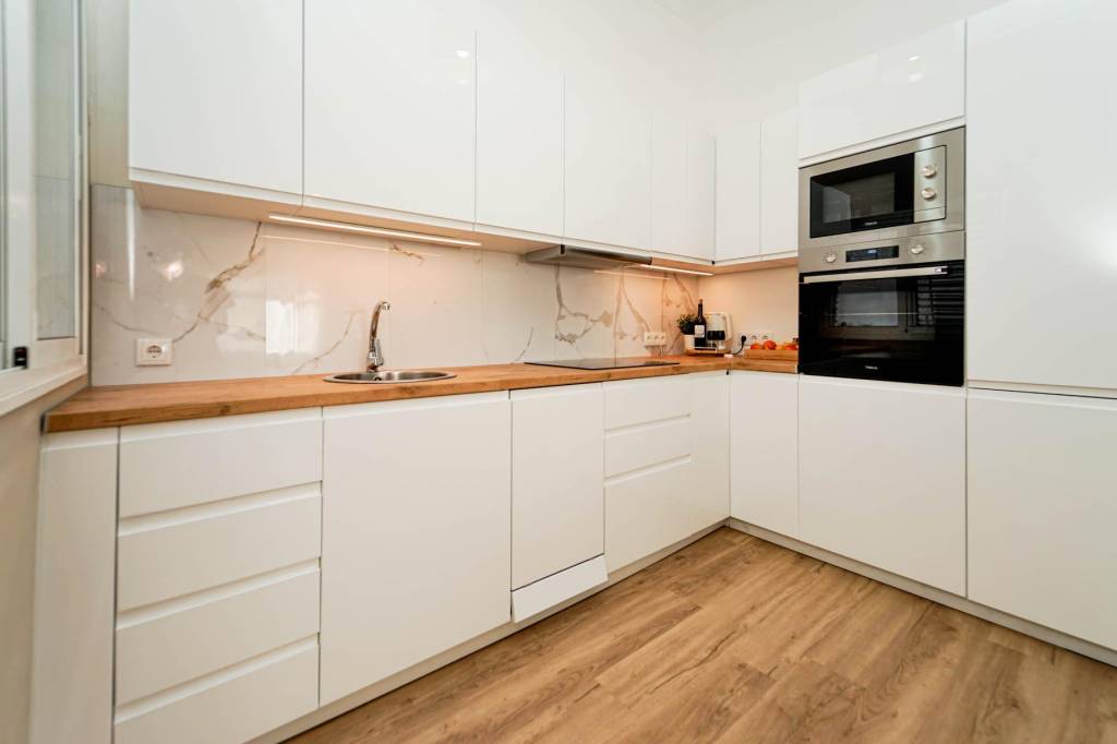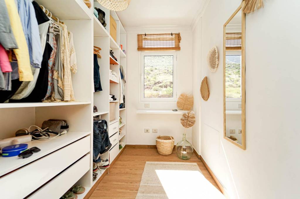 La vivienda dispone de tres dormitorios, aunque actualmente uno de ellos se ha transformado en un vestidor moderno y espacioso, perfecto para organizar su ropa y complementos con estilo. La planta baja destaca por sus techos altos, que otorgan una sensación de amplitud y ligereza en el salón y la cocina, ambos espacios pensados para la vida diaria con un diseño impecable y funcional.