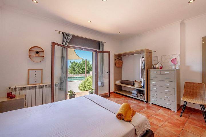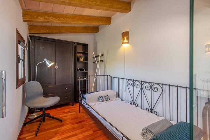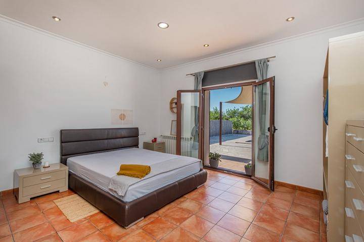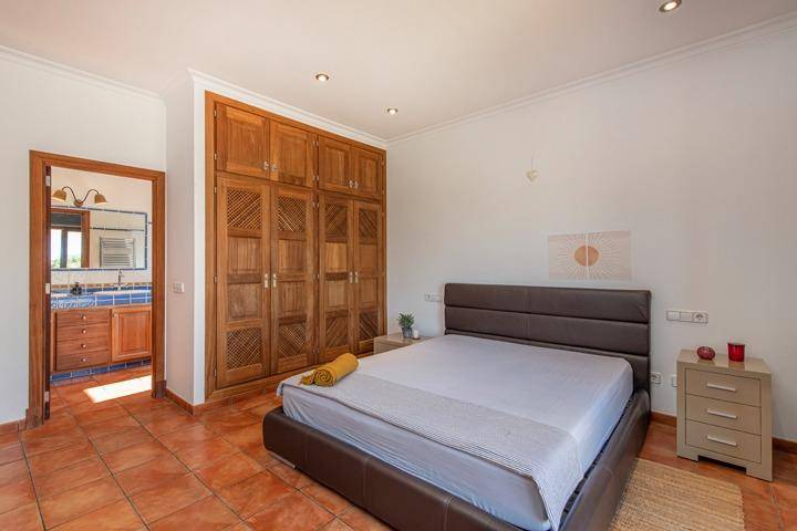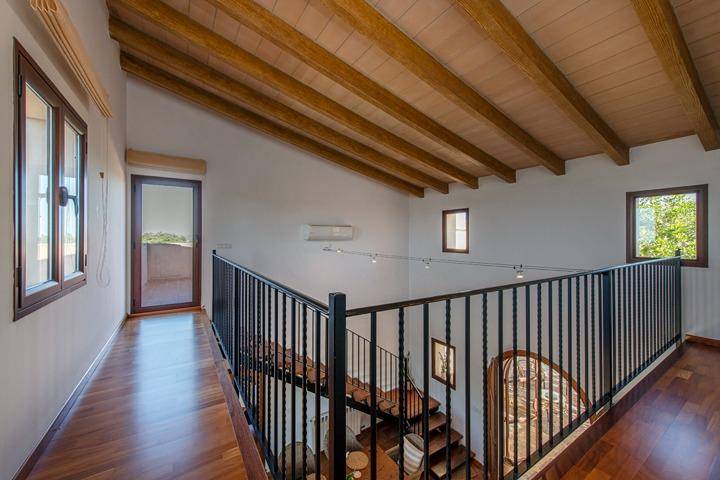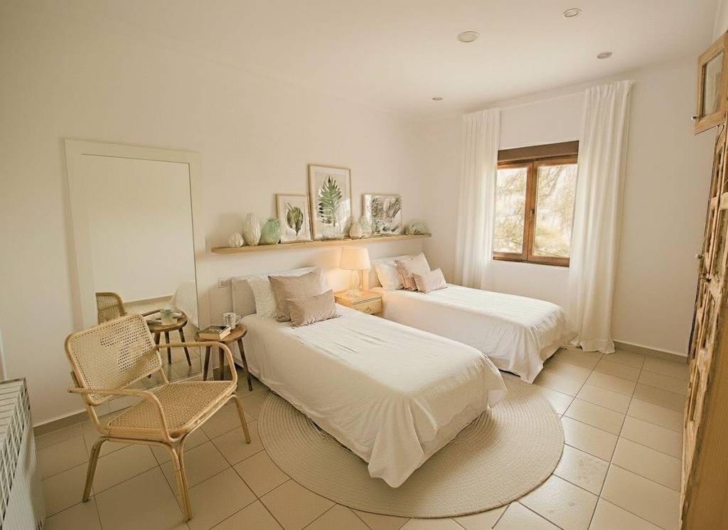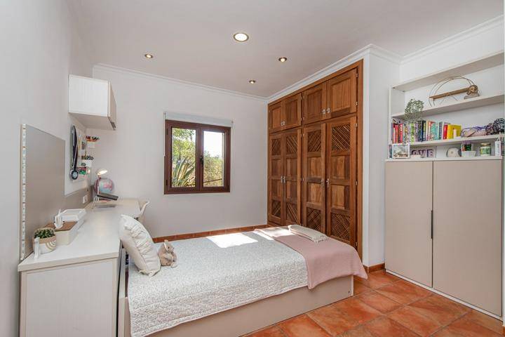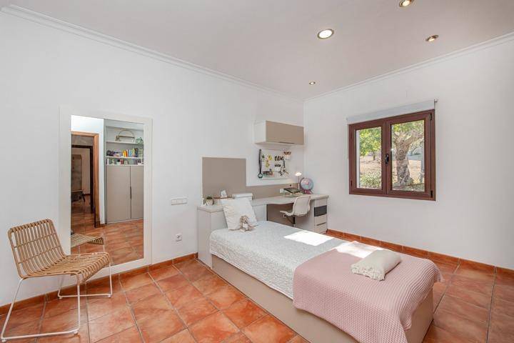 En la planta superior se sitúa el tercer dormitorio, acompañado de una pequeña estancia adicional que puede utilizarse como despacho, vestidor o dormitorio auxiliar. Desde aquí el paisaje se abre aún más, ofreciendo vistas despejadas sobre el campo mallorquín y, en los días claros, la silueta de la isla de Cabrera en el horizonte.