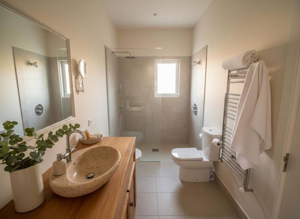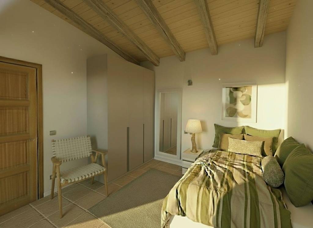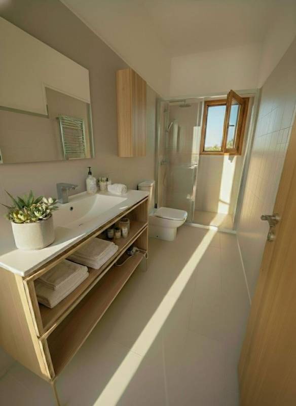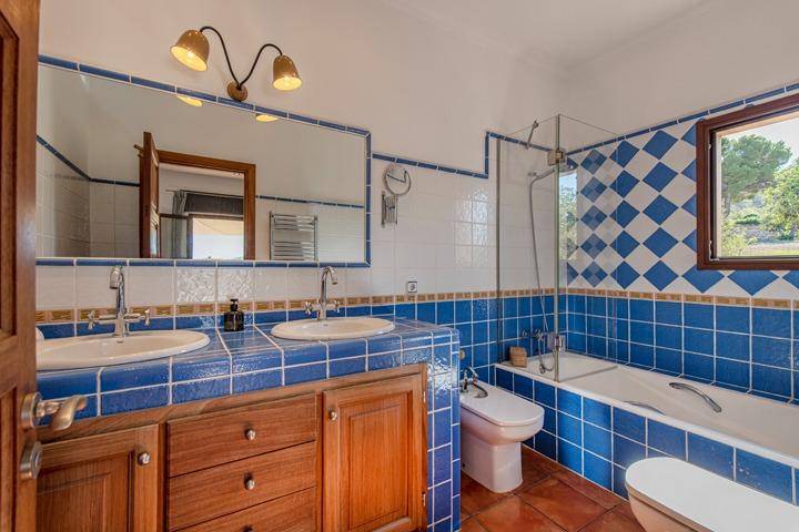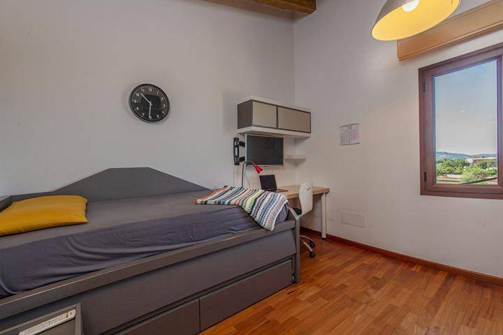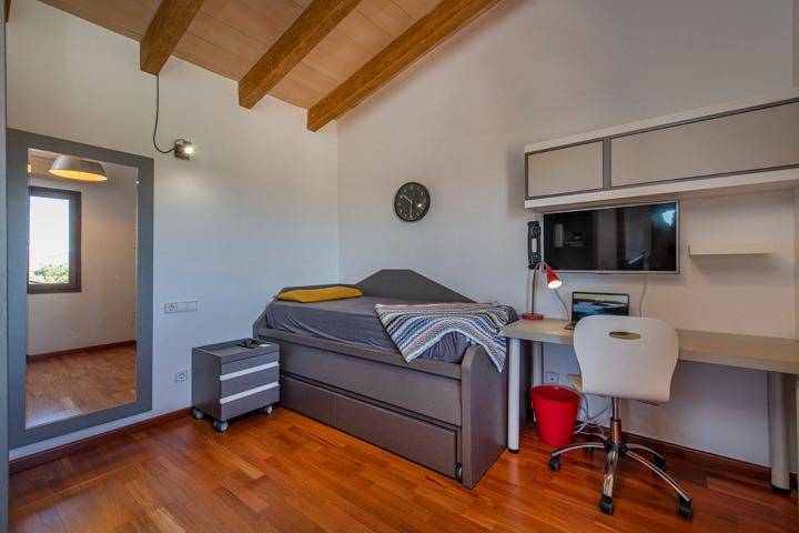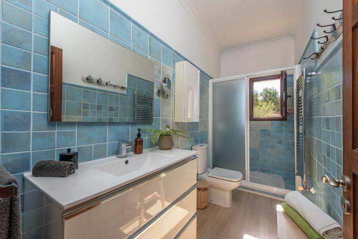 En la planta superior se sitúa el tercer dormitorio, acompañado de una pequeña estancia adicional que puede utilizarse como despacho, vestidor o dormitorio auxiliar. Desde aquí el paisaje se abre aún más, ofreciendo vistas despejadas sobre el campo mallorquín y, en los días claros, la silueta de la isla de Cabrera en el horizonte.