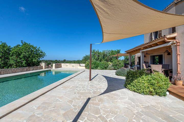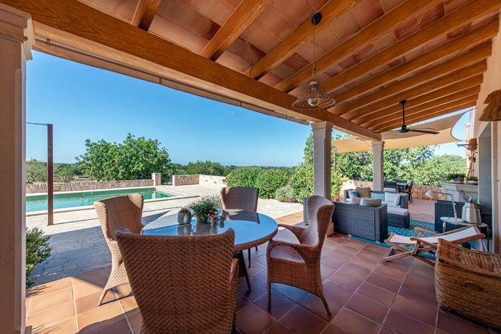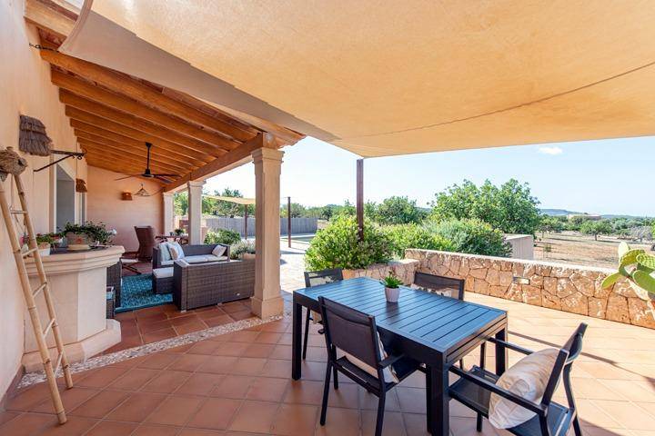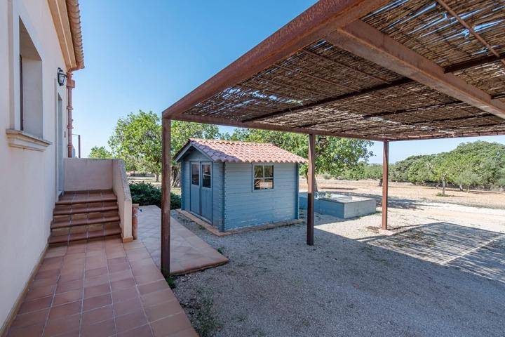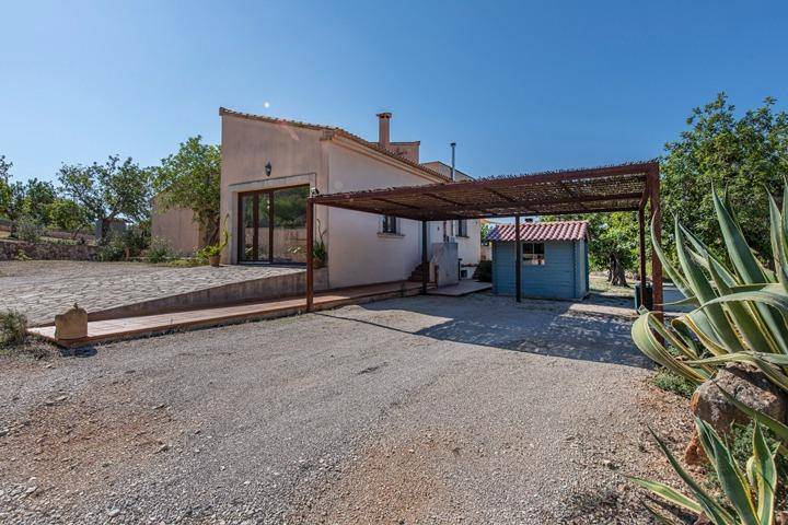 El exterior invita a vivir la finca durante todo el año. Una amplia terraza orientada al suroeste se convierte en el lugar perfecto para disfrutar del sol y de las puestas de sol mallorquinas, mientras la piscina ofrece un espacio ideal para refrescarse durante el verano. La propiedad cuenta además con acceso automático, garaje y un porche cubierto para vehículos.