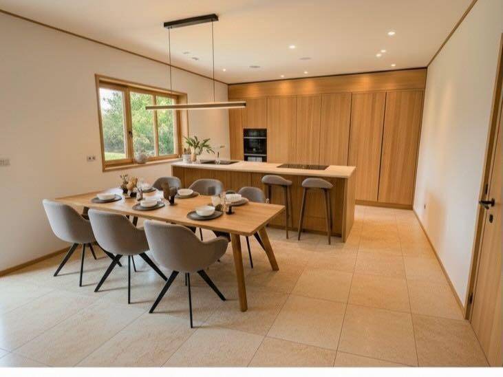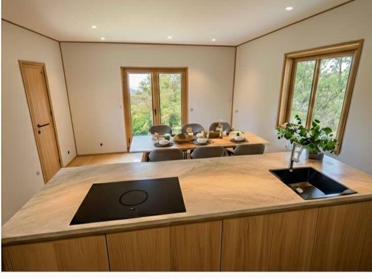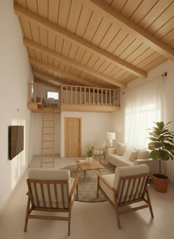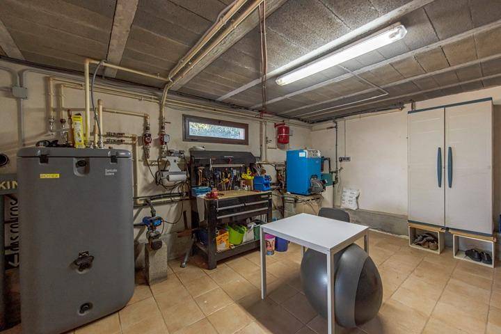 En la planta principal se encuentran dos de los dormitorios y los dos baños, junto con una cocina equipada con chimenea que invita a largas sobremesas y un salón-comedor donde interior y exterior se conectan de forma natural. En esta misma planta encontramos también una lavandería independiente y una sala multifuncional con altillo, ideal para teletrabajar o crear un espacio personal.