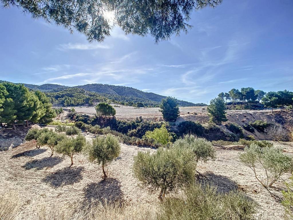 El terreno combina pinar y matorral con olivos de secano y 250 olivos aprox , sobre orografía ondulada con tramos llanos. La casa recibe las cuatro orientaciones y la luz recorre las estancias durante el día. Suministros: luz y agua de red y saneamiento por pozo negro, acceso asfaltado .