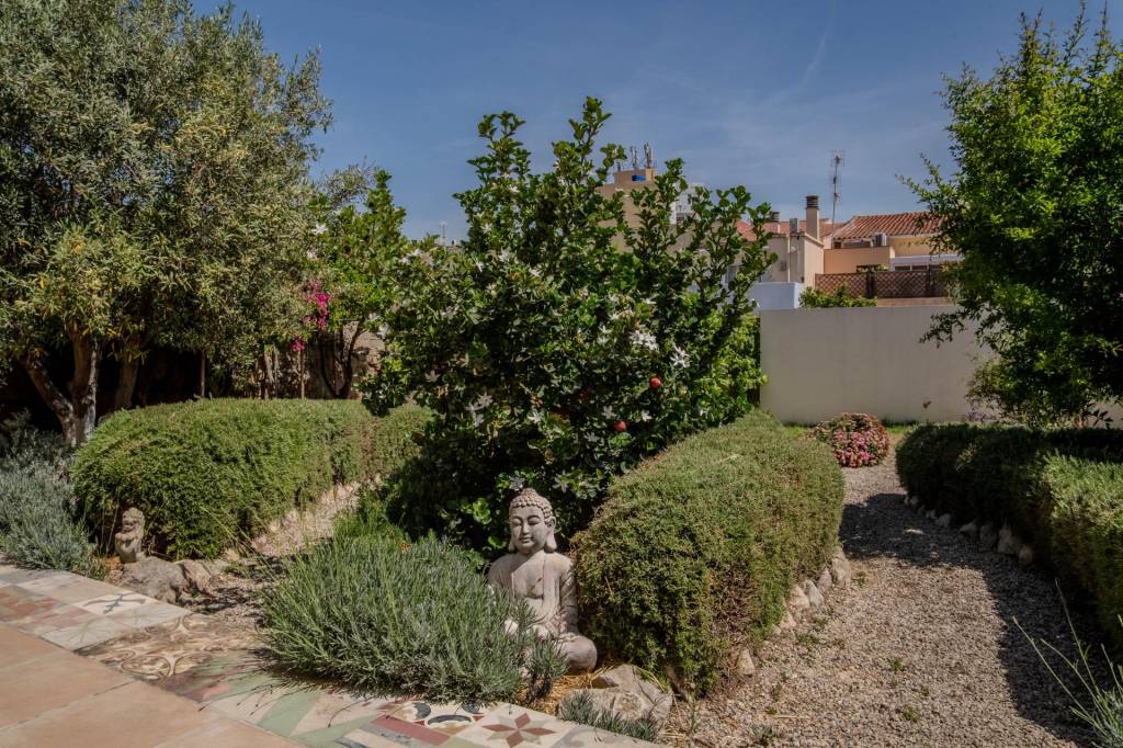 Tras un portón automático se accede a una zona de estacionamiento para tres vehículos y a un amplio jardín mediterráneo privado con higueras, olivos, naranjos, limoneros y aromáticas. La planta baja disfruta de terraza cubierta junto al jardín; la primera planta ofrece balcón lineal y la azotea-solárium brinda vistas parcialmente despejadas y aloja las placas solares.