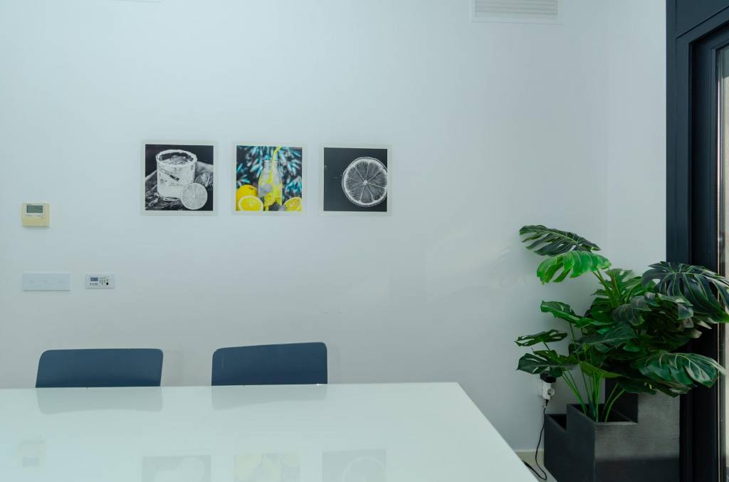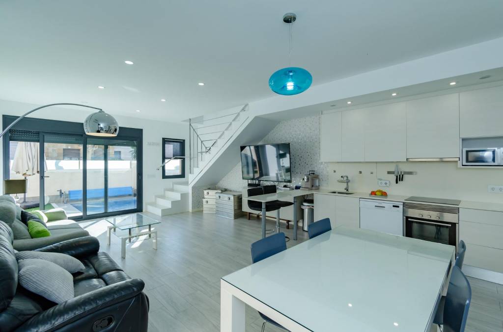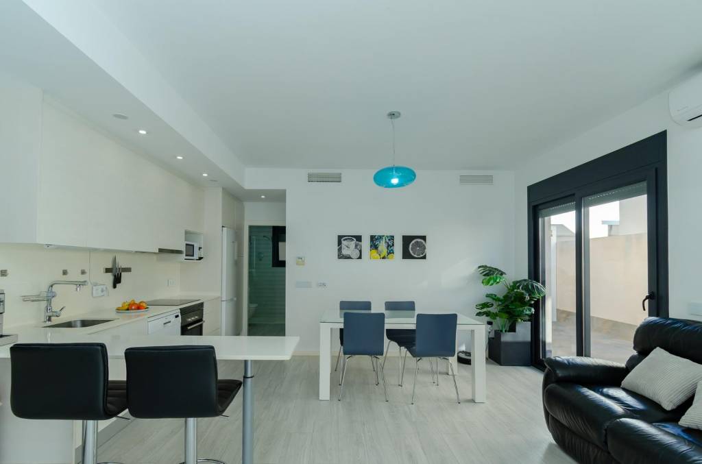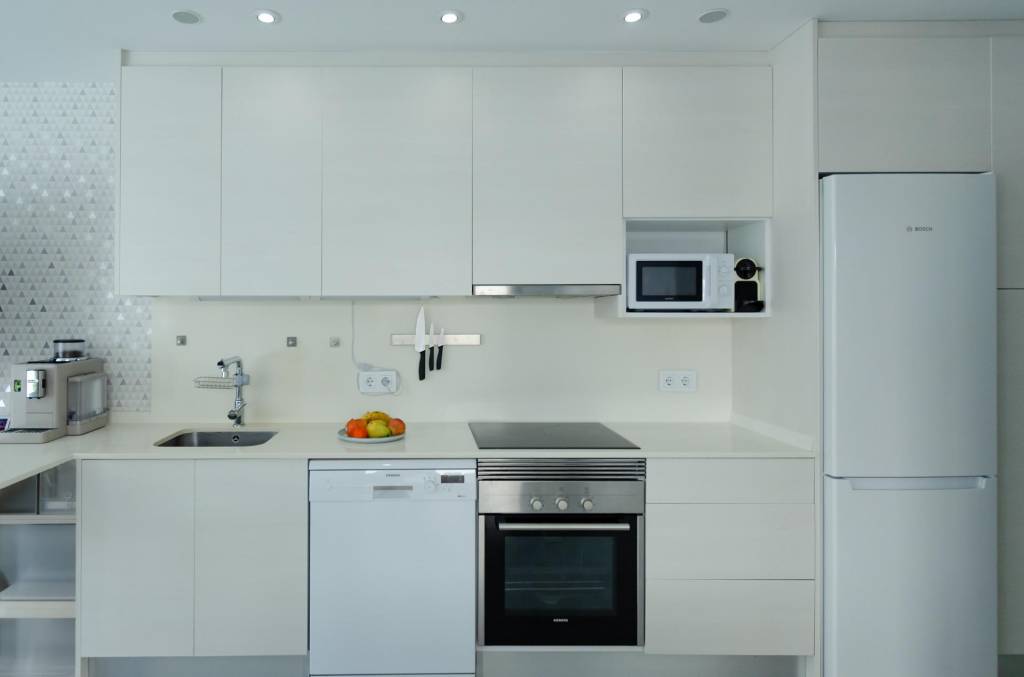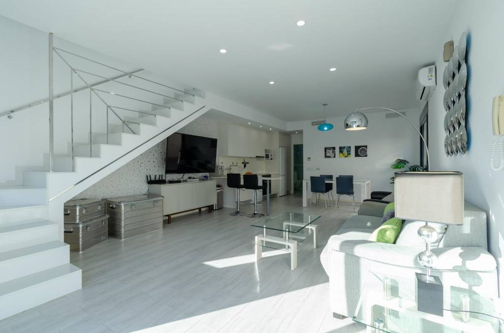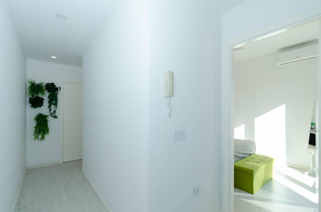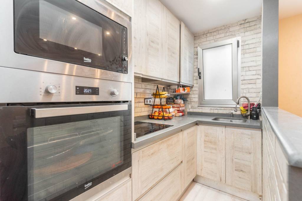 Una vez accedemos, nos encontramos directamente con un salón-cocina, dando el salón acceso a una pequeña terraza en la que actualmente se encuentran la lavadora y secadora. Desde ella se dispone de una toma que introduce aire filtrado dentro de la propiedad. La cocina equipada con microondas y horno en columna, vitrocerámica y nevera, con una pequeña separación de la zona de estar, en la que tenemos un sofá chaise longue y una mesa de TV. Tanto la cocina como la terraza poseen ventanas al patio de luces.