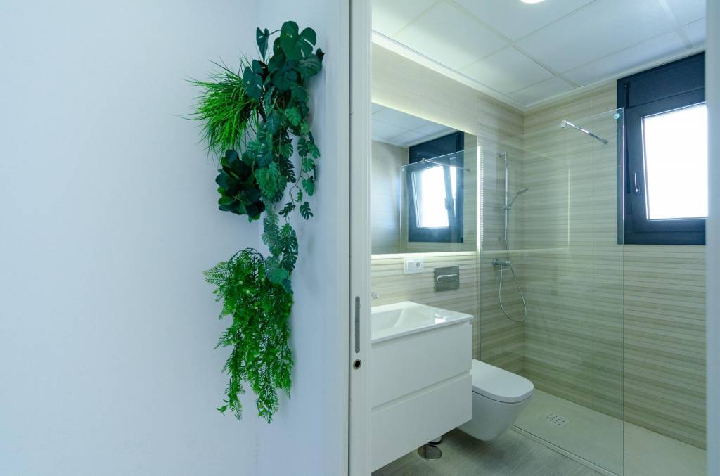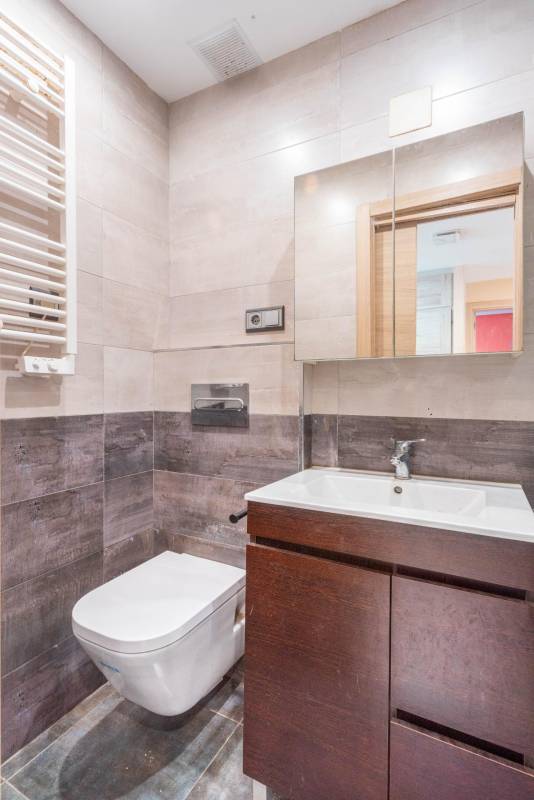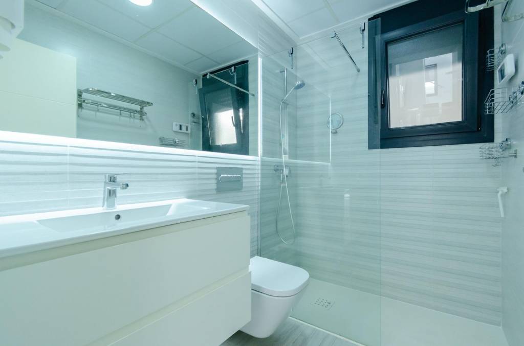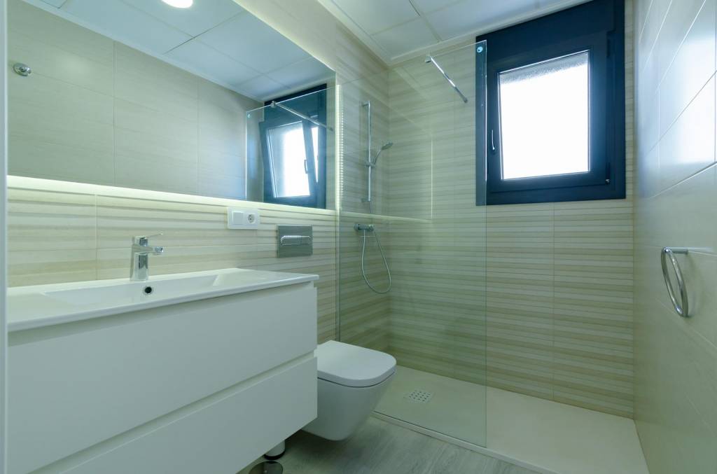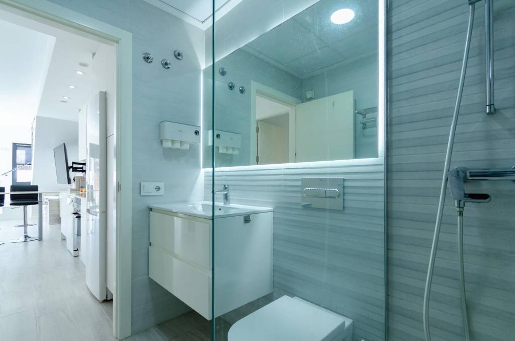 A su lado, un pequeño baño que dispone de plato de ducha, lavabo con mueble, espejo y WC.