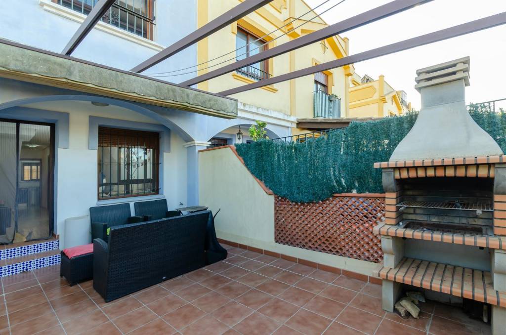 El porche cuenta con dos conjuntos de mobiliario de jardín, barbacoa de obra y pérgola de aluminio con toldo corredizo.