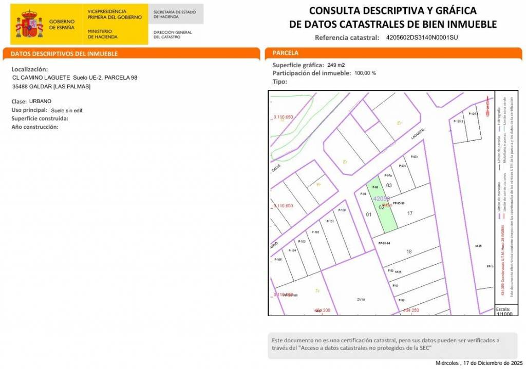 Este solar urbano de 248,70 m², situado en Camino Laguete, una de las calles principales de la zona de Los Quintana (Gáldar), es una oportunidad excepcional para quien quiere construir a lo grande, con presencia, comodidad y proyección.
