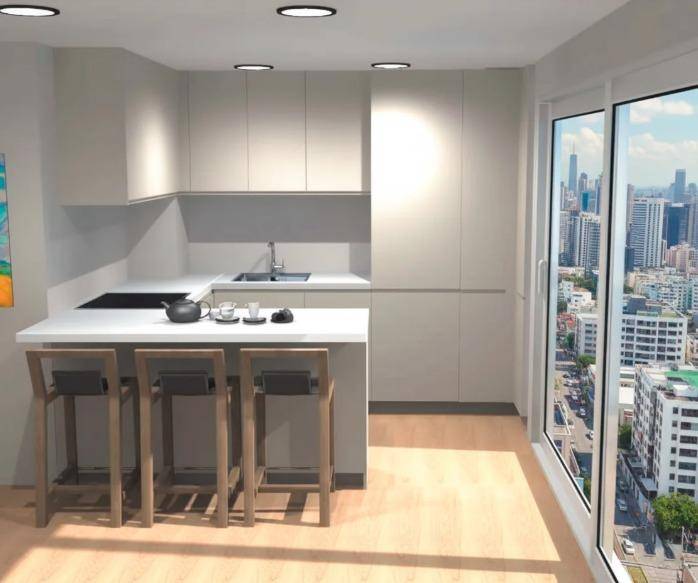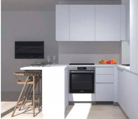 • Cocina de alta gama con muebles altos y bajos, acabado laminado