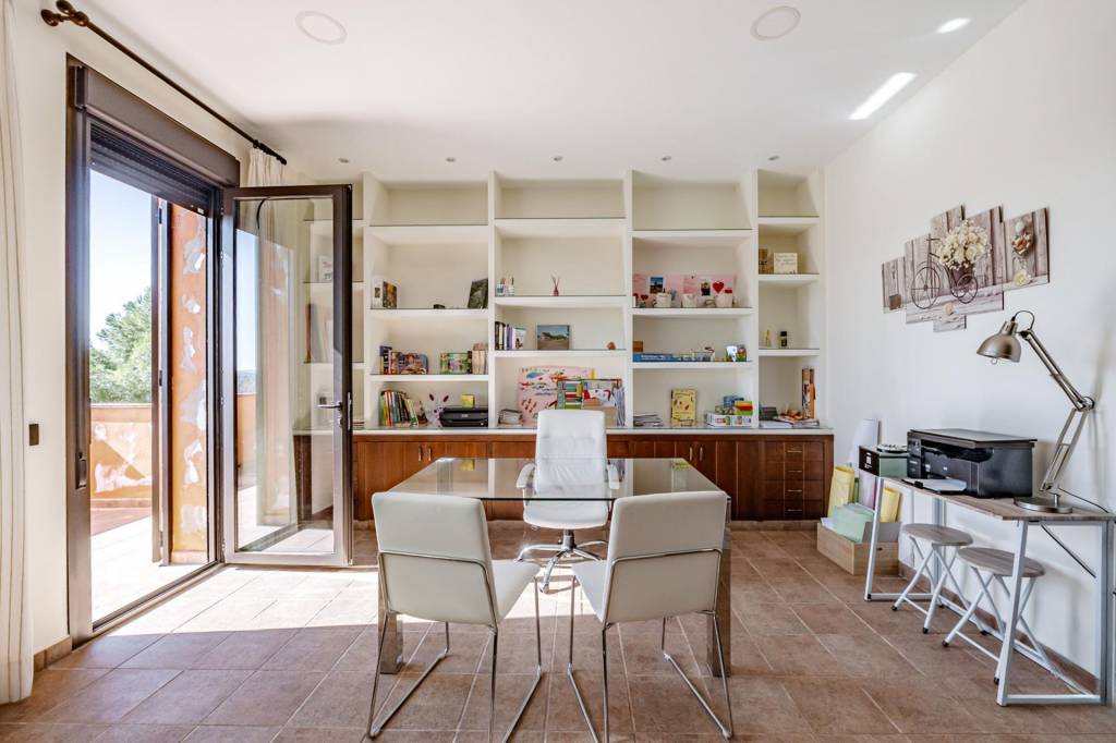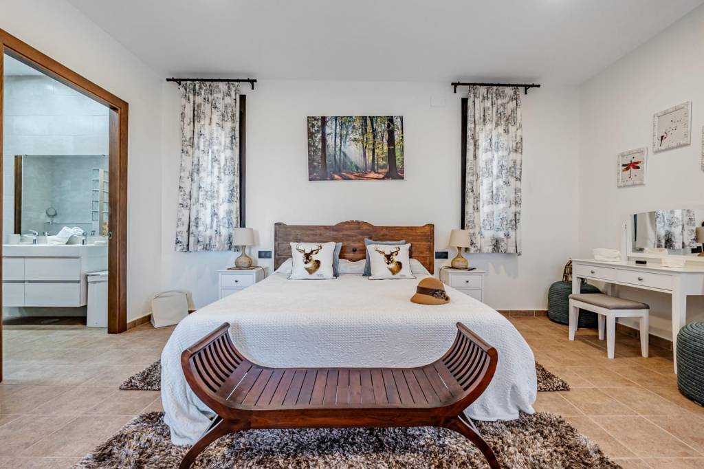 Desde el salón comedor, una ancha escalera nos lleva a la segunda planta donde tenemos la zona del dormitorio principal. Al coronar, un hall de gran amplitud nos lleva por la derecha a la zona de descanso con baño en suite y terraza con unas maravillosas vistas a la finca y por la izquierda a una zona de despacho con una segunda terraza también con vistas.