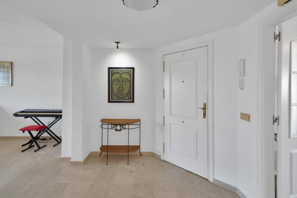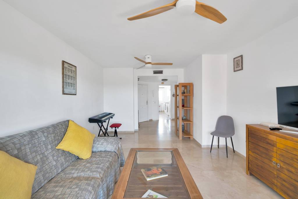 En el interior, el apartamento cuenta con una distribución amplia y equilibrada, pensada para el confort diario. El salón-comedor, amplio y muy luminoso, tiene acceso directo a una terraza orientada al oeste, ideal para relajarse, comer al aire libre y disfrutar de las vistas al jardín, la piscina y el mar, especialmente al atardecer.