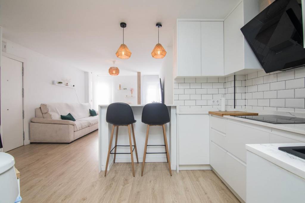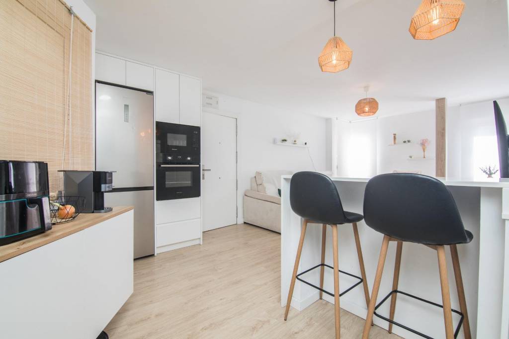 La cocina, de diseño contemporáneo, se entrega totalmente equipada con electrodomésticos, lista para usar desde el primer momento. Todo el inmueble ha sido renovado con materiales de calidad, ofreciendo una imagen fresca y actual.