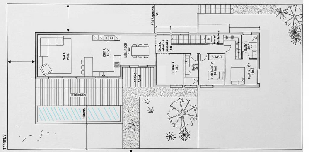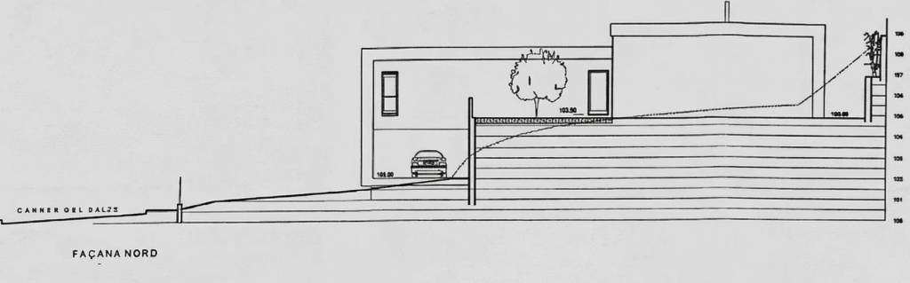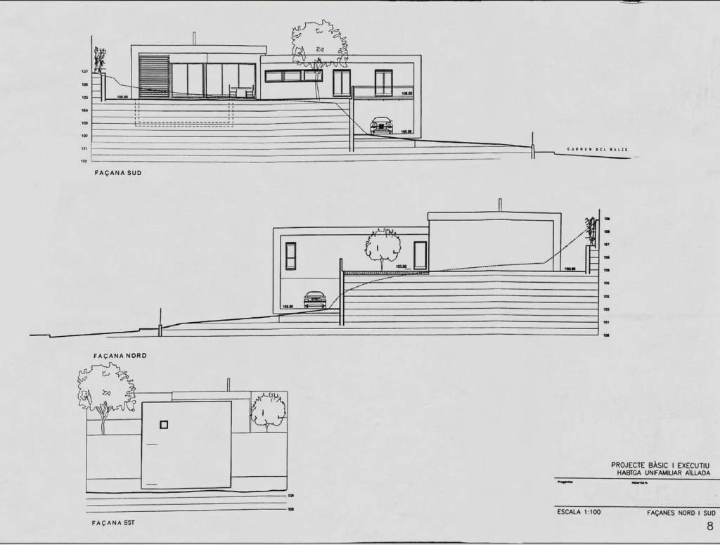 Dispone de un proyecto básico y ejecutivo previo de vivienda unifamiliar aislada, diseñado para adaptarse a la pendiente natural del terreno y aprovechar al máximo la relación entre interior y exterior.
