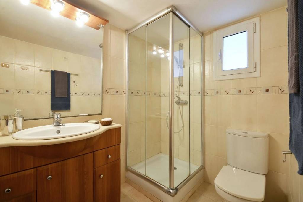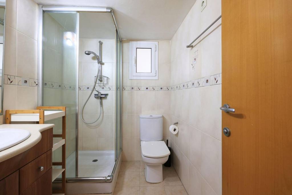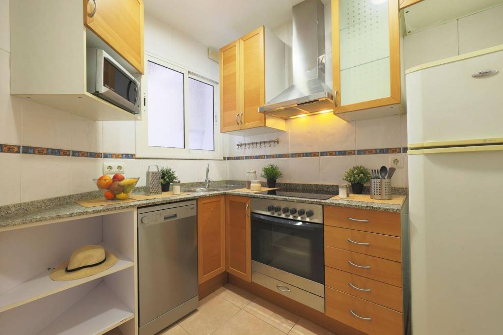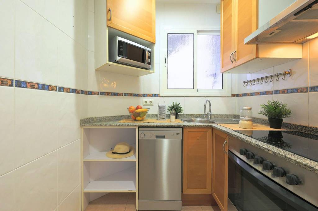 El baño es completo, con plato de ducha y ventana, se entrega amueblado. La cocina está totalmente equipada y amueblada, con placa de inducción eléctrica y electrodomésticos incluidos: nevera, lavavajillas, microondas, lavadora y horno.