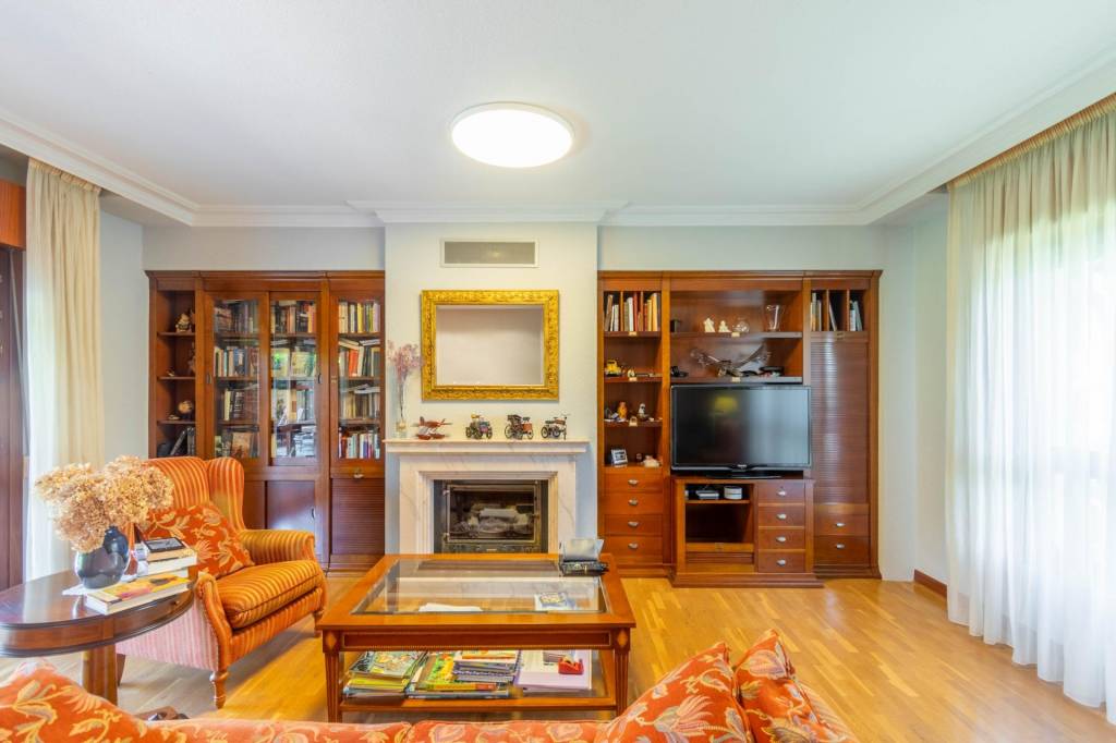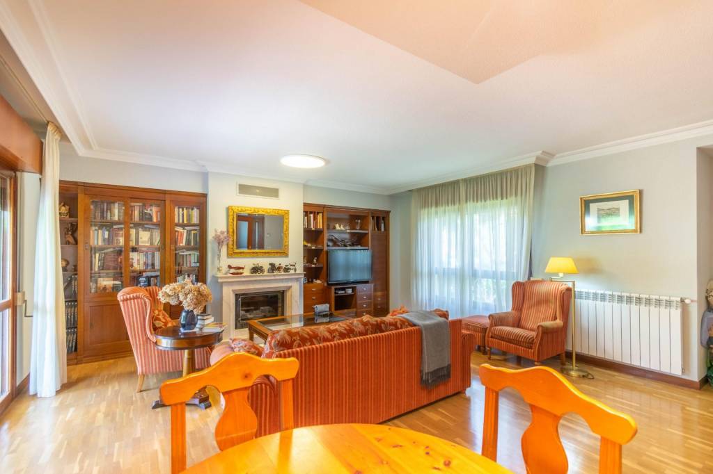 La vivienda transmite calidez y armonía. El salón se abre como el verdadero corazón de la casa: un espacio amplio y lleno de luz natural gracias a sus dos ventanales, donde la chimenea aporta ese toque acogedor que invita a disfrutar de largas tardes en familia o momentos de descanso en invierno. Uno de los ventanales conecta directamente con el jardín, integrando interior y exterior de forma natural.
