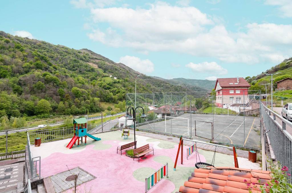 Parque infantil, pista de juegos, zonas ajardinadas y vistas a la montaña sobre el río.