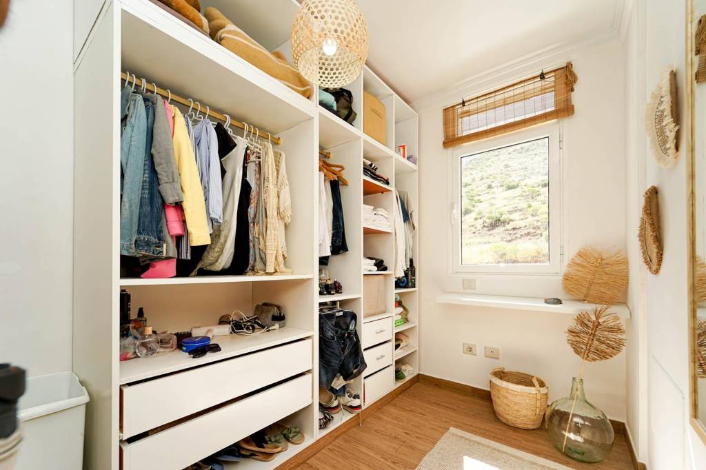 La vivienda dispone de tres dormitorios, aunque actualmente uno de ellos se ha transformado en un vestidor moderno y espacioso, perfecto para organizar su ropa y complementos con estilo. La planta baja destaca por sus techos altos, que otorgan una sensación de amplitud y ligereza en el salón y la cocina, ambos espacios pensados para la vida diaria con un diseño impecable y funcional.