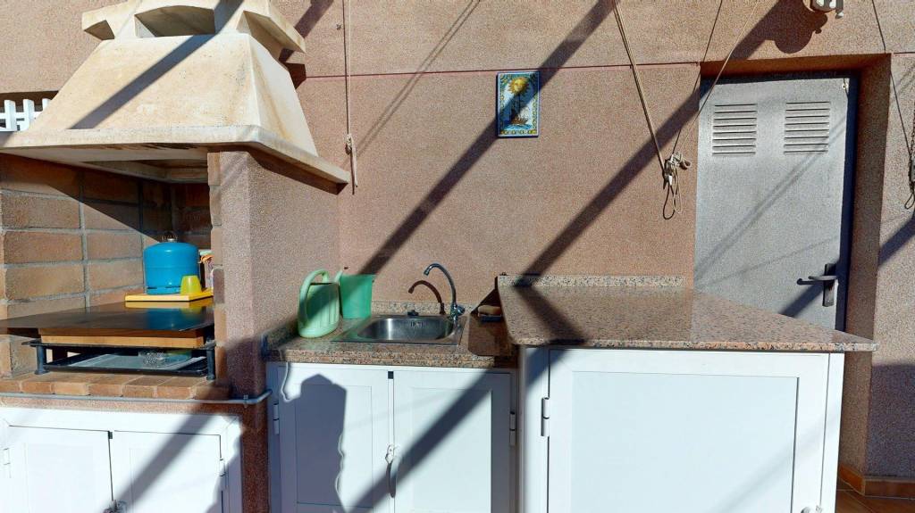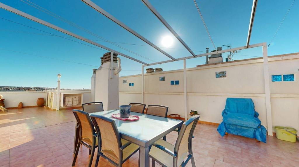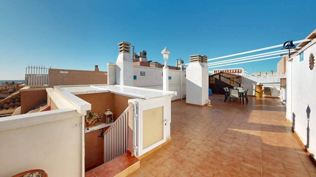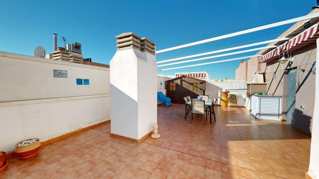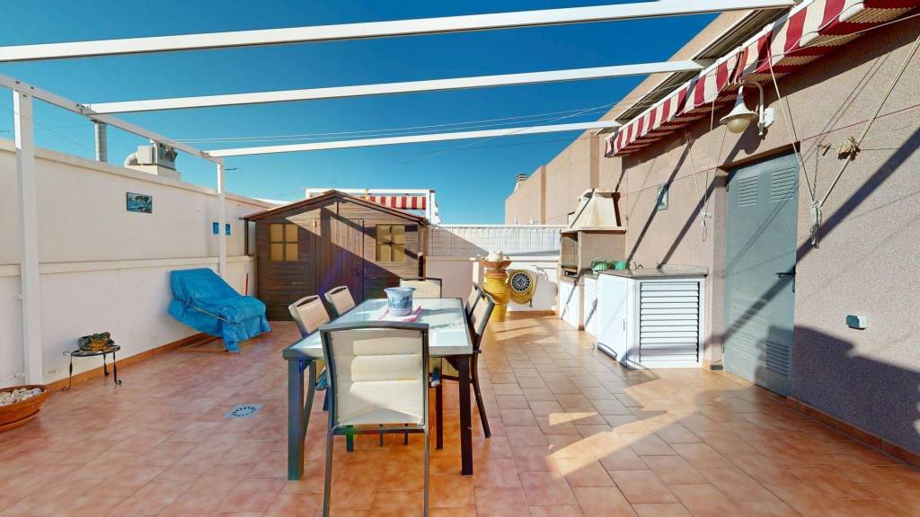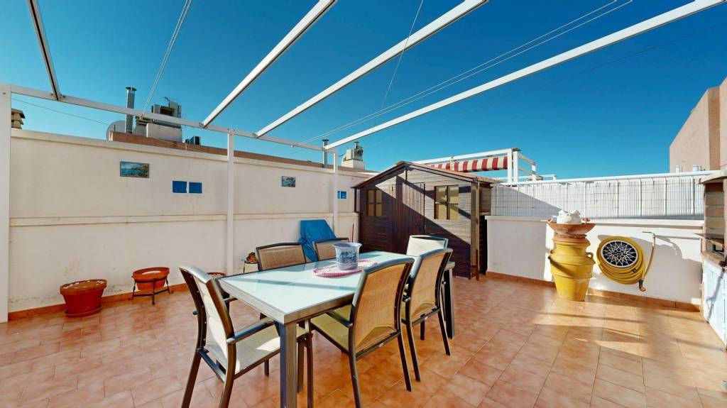 En la parte superior, el apartamento cuenta con un espectacular ático-solárium privado de 72 m2, ideal para disfrutar del clima mediterráneo, equipado con barbacoa, trastero, casita de madera, toldos y cerramientos, además de vistas despejadas al mar.