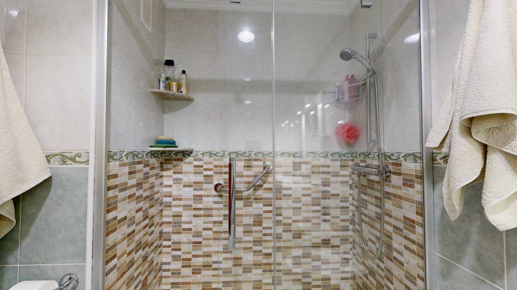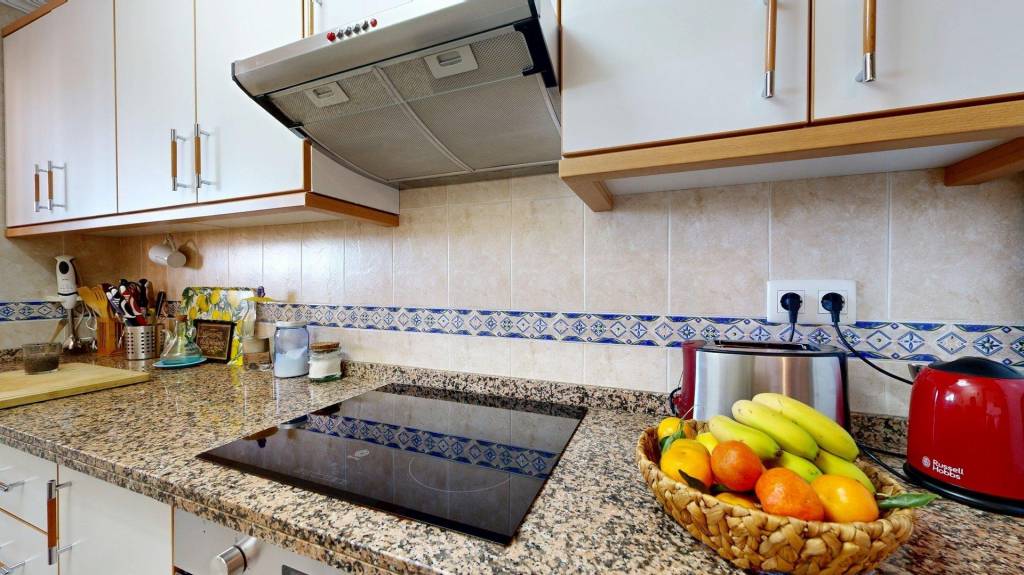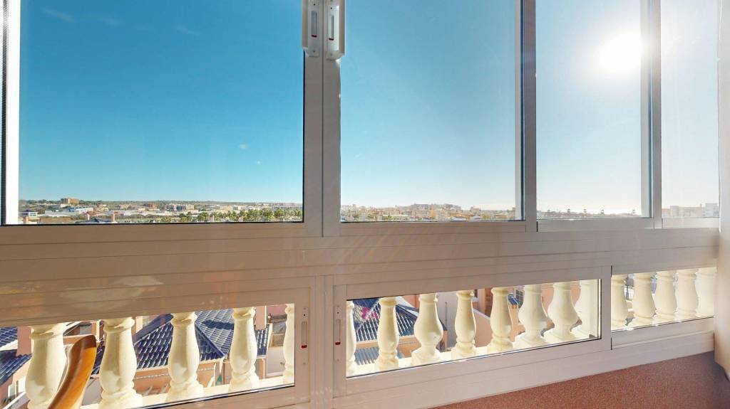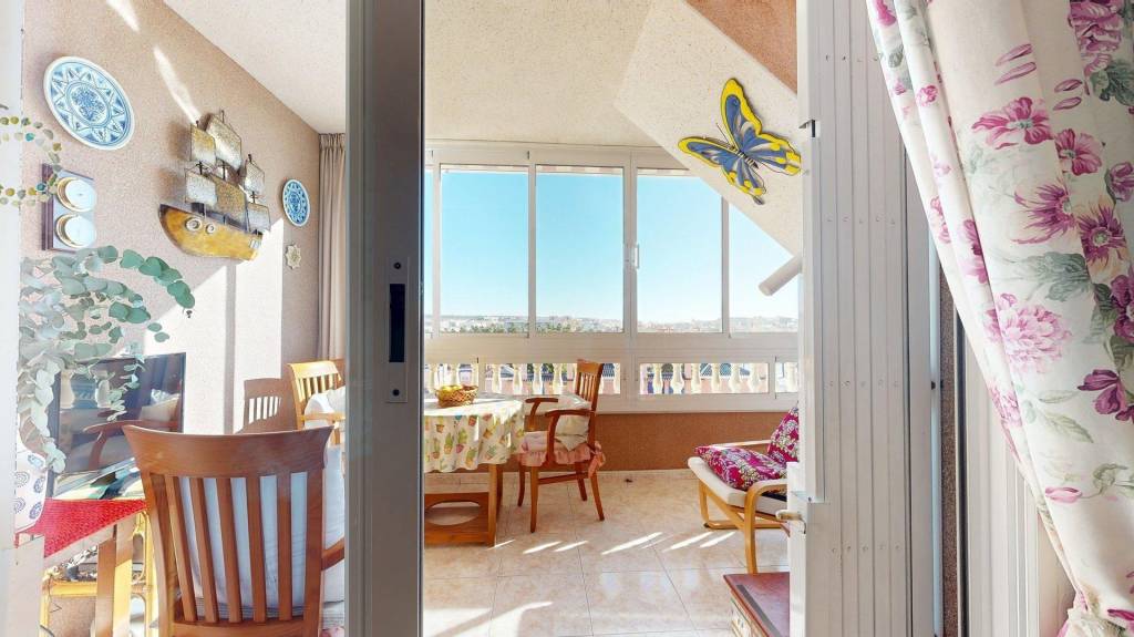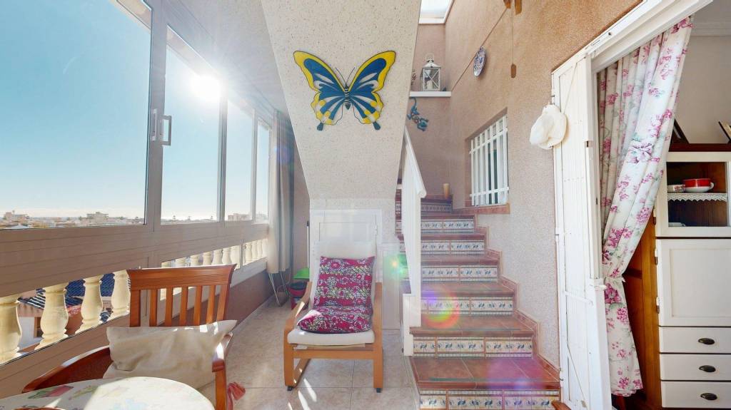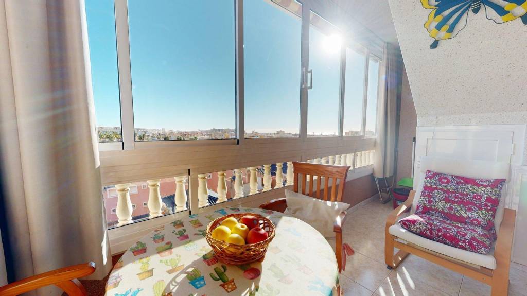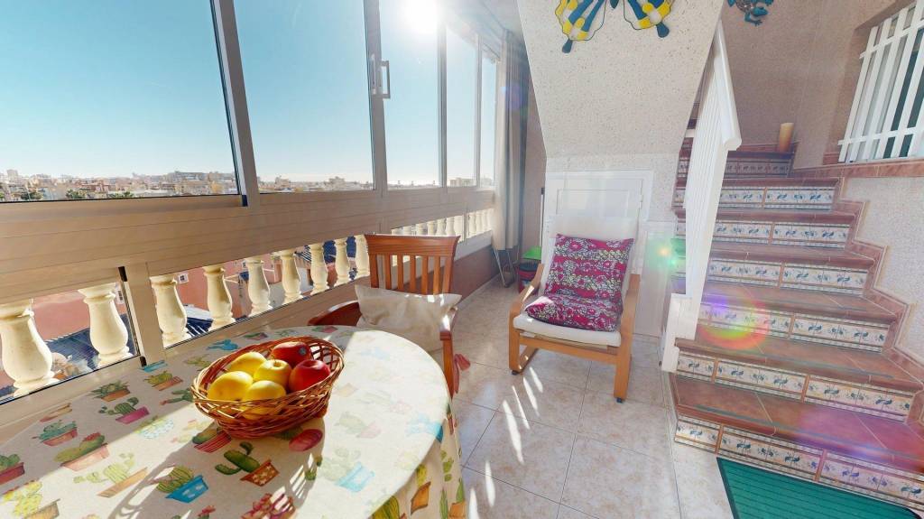 En la parte superior, el apartamento cuenta con un espectacular ático-solárium privado de 72 m2, ideal para disfrutar del clima mediterráneo, equipado con barbacoa, trastero, casita de madera, toldos y cerramientos, además de vistas despejadas al mar.