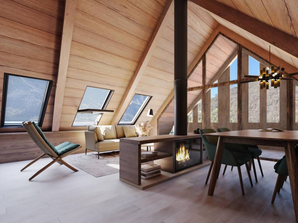 El proyecto ha respetado al máximo la esencia de las bordas pirenaicas: fachadas de piedra y madera natural, cubiertas inclinadas y proporciones armoniosas con el entorno. Al entrar en la vivienda, uno se encuentra con un gran espacio abierto donde se integran la cocina y el salón. La cocina, moderna y funcional, se ha diseñado para convivir con la vida social del hogar: isla central, electrodomésticos integrados y acabados de calidad. El salón, con sus techos altos abuhardillados revestidos en madera, transmite una calidez especial; las vigas vistas y la luz natural que entra por los ventanales crean un ambiente acogedor durante todo el año, ideal para tardes de chimenea o reuniones familiares tras una jornada de montaña.