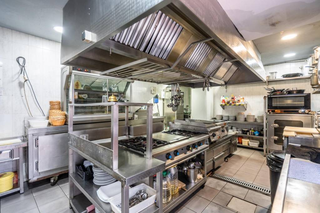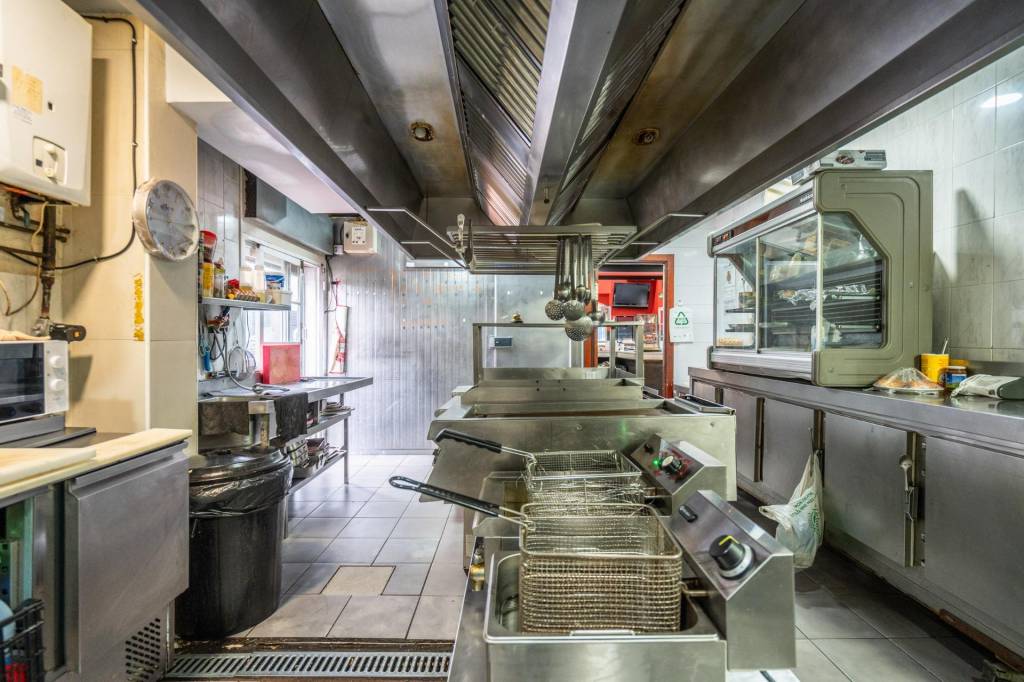 En la planta baja se encuentra una amplia barra con zona de recibidor, acceso directo a la cocina y un salón luminoso y espacioso. La cocina industrial está totalmente equipada, dividida en diferentes áreas de trabajo y con salida directa a una terraza cerrada privada, actualmente utilizada como almacén exterior.