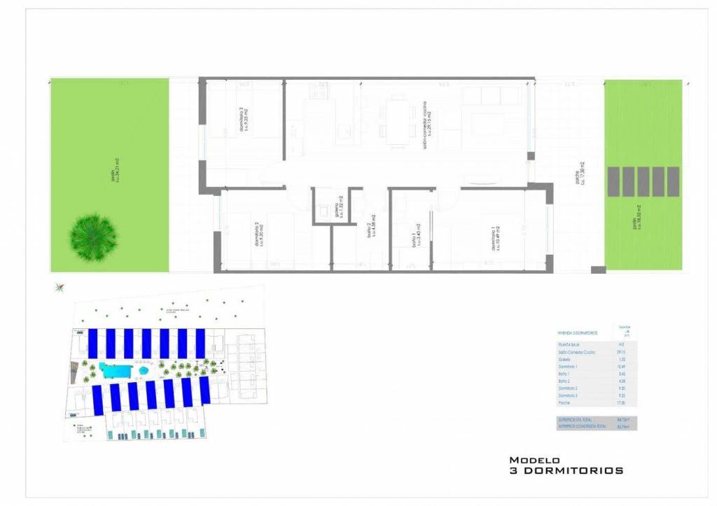 Este apartamento de 3 dormitorios en la planta baja consta de un salón con puertas que dan al gran jardín/terraza donde tiene la opción de añadir una piscina privada, una cocina moderna de planta abierta con electrodomésticos integrados que incluyen horno, vitrocerámica, extractor, zona de comedor, un dormitorio principal con armarios empotrados y baño en suite, otros dos dormitorios dobles y un baño de invitados. También hay una terraza trasera a la que se puede acceder desde el dormitorio 2 y 3.