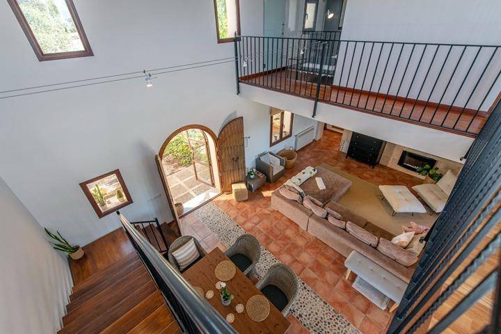 En la planta superior, se sitúa la tercera habitación, junto a una cuarta habitación multifuncional que puede ser adaptada como despacho o cuarto adicional. Desde la terraza superior, podrás disfrutar de unas impresionantes vistas despejadas hacia la piscina y la isla de Cabrera, un lugar perfecto para relajarse y disfrutar del entorno.