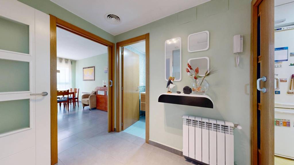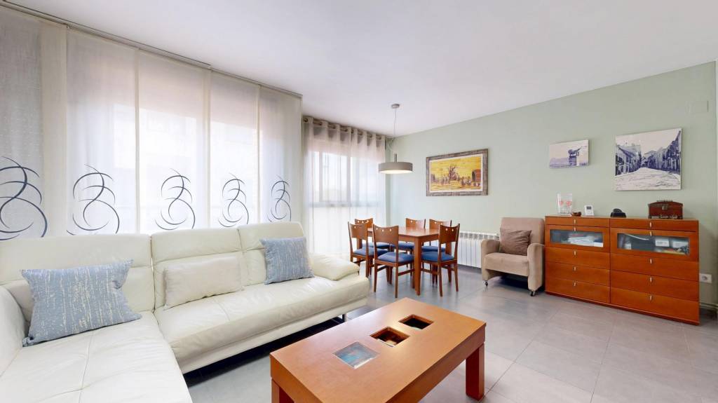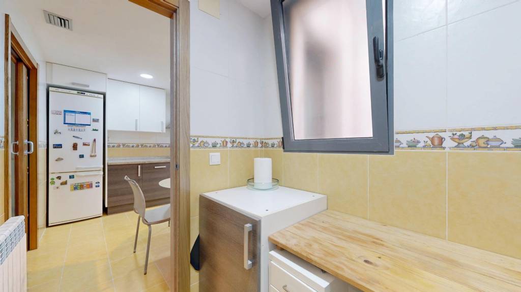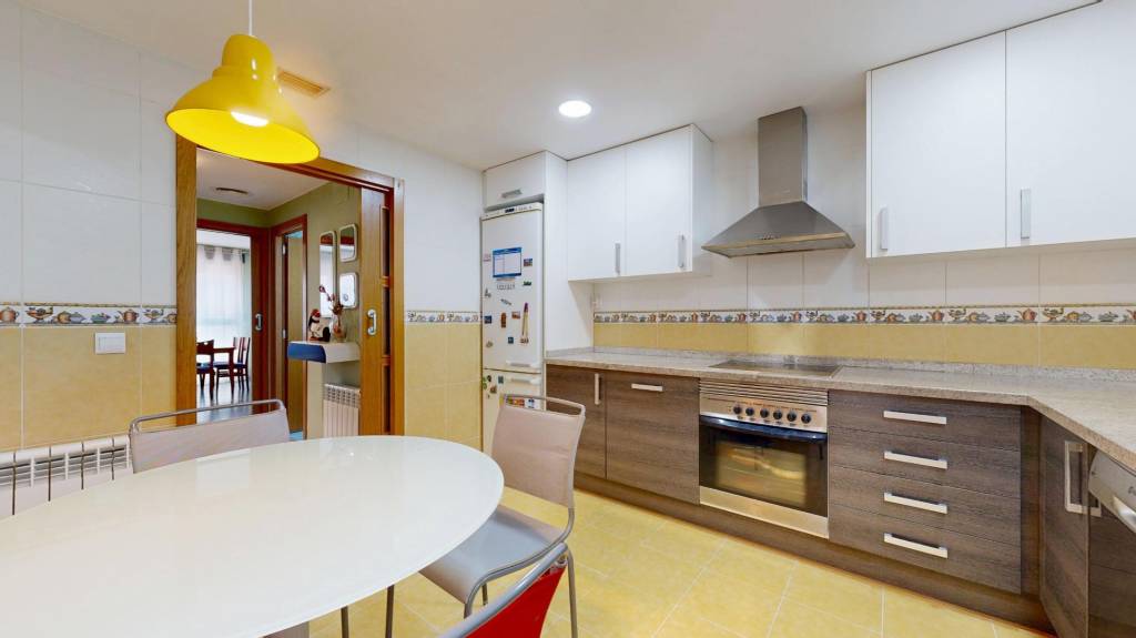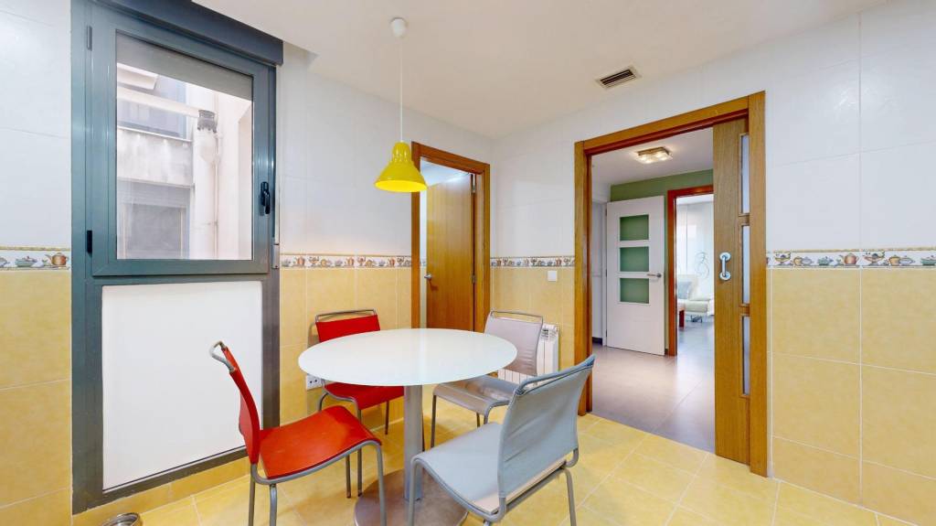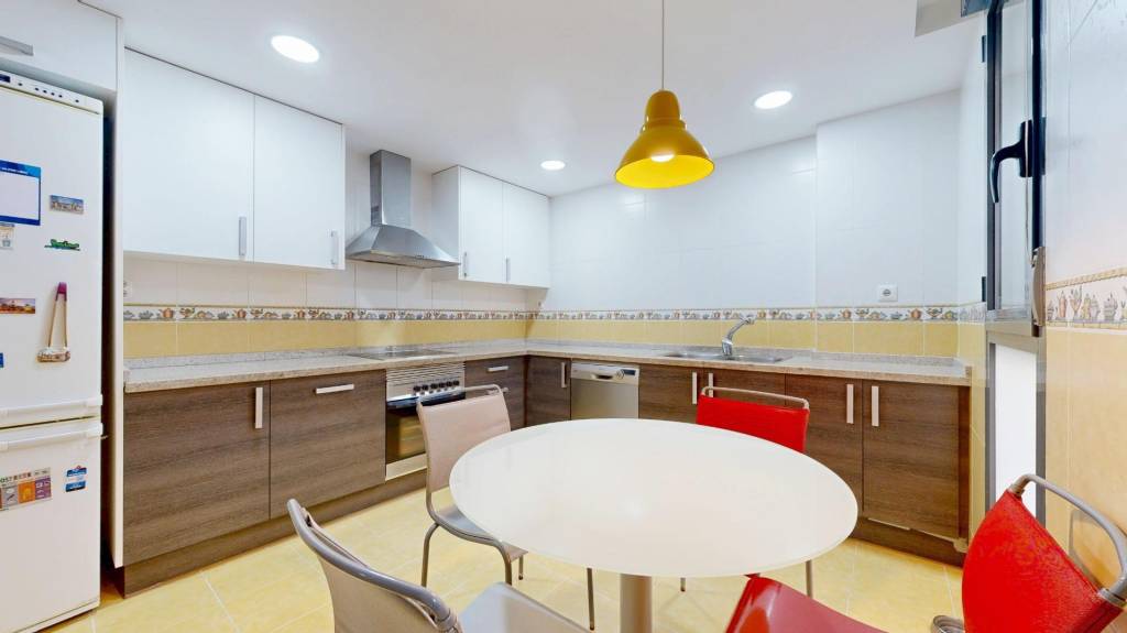 Accedemos a la planta principal , recibiéndonos un gran salón comedor , muy luminoso provisto de balcón , frente a este se encuentra la cocina con espacio para mesa y sillas , con zona de despensa proporcionando mas espacio de almacenaje .
