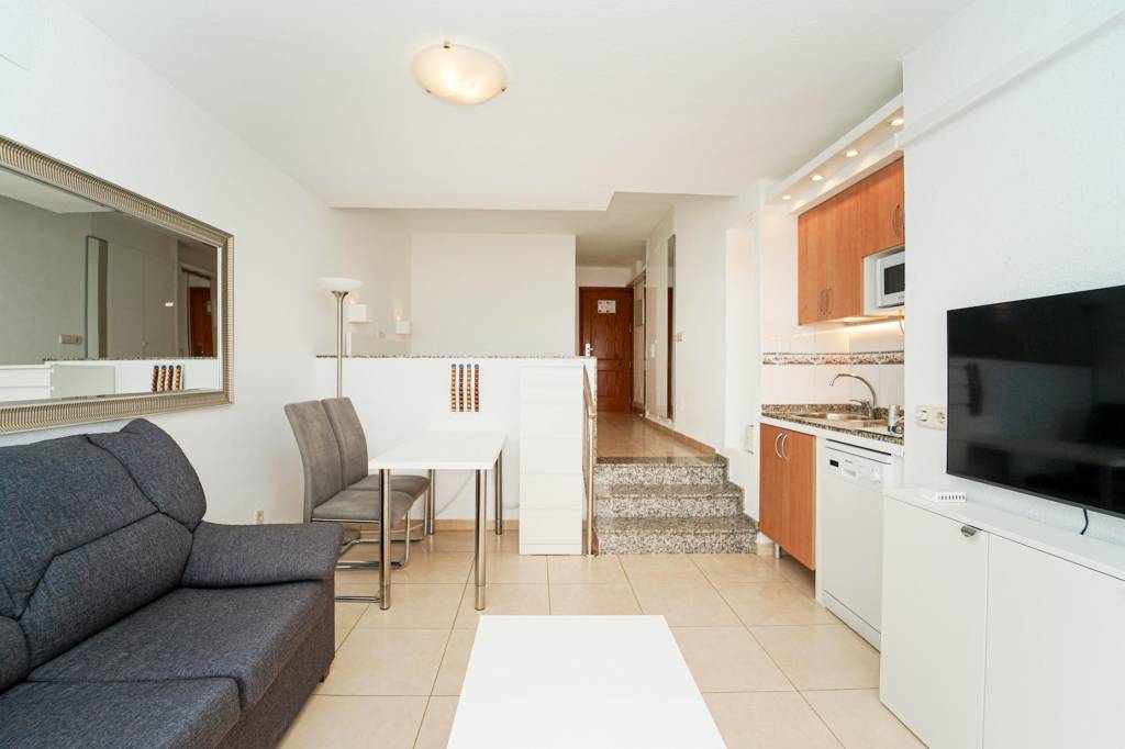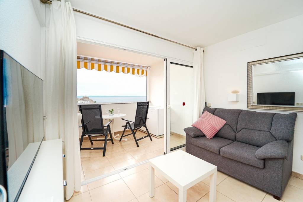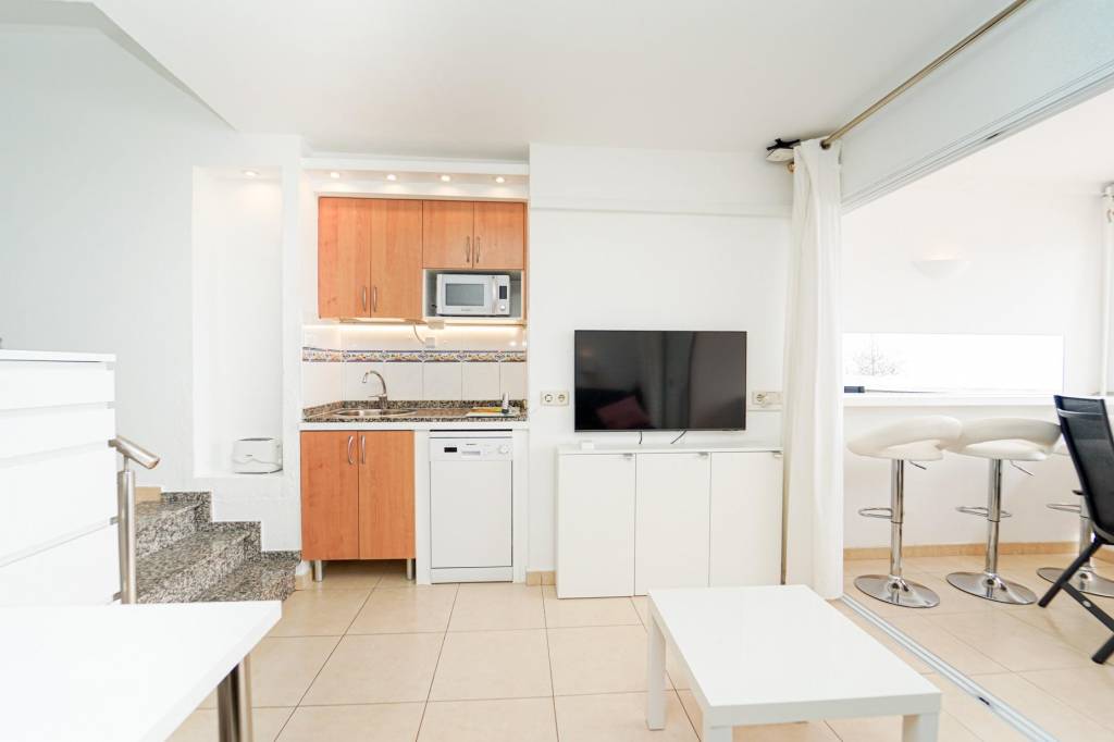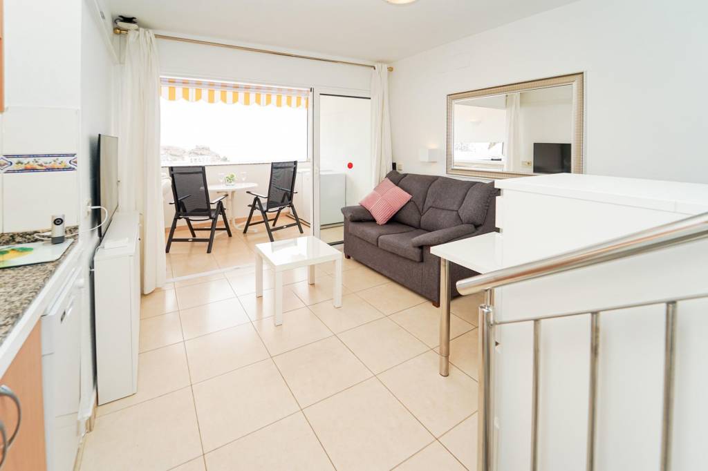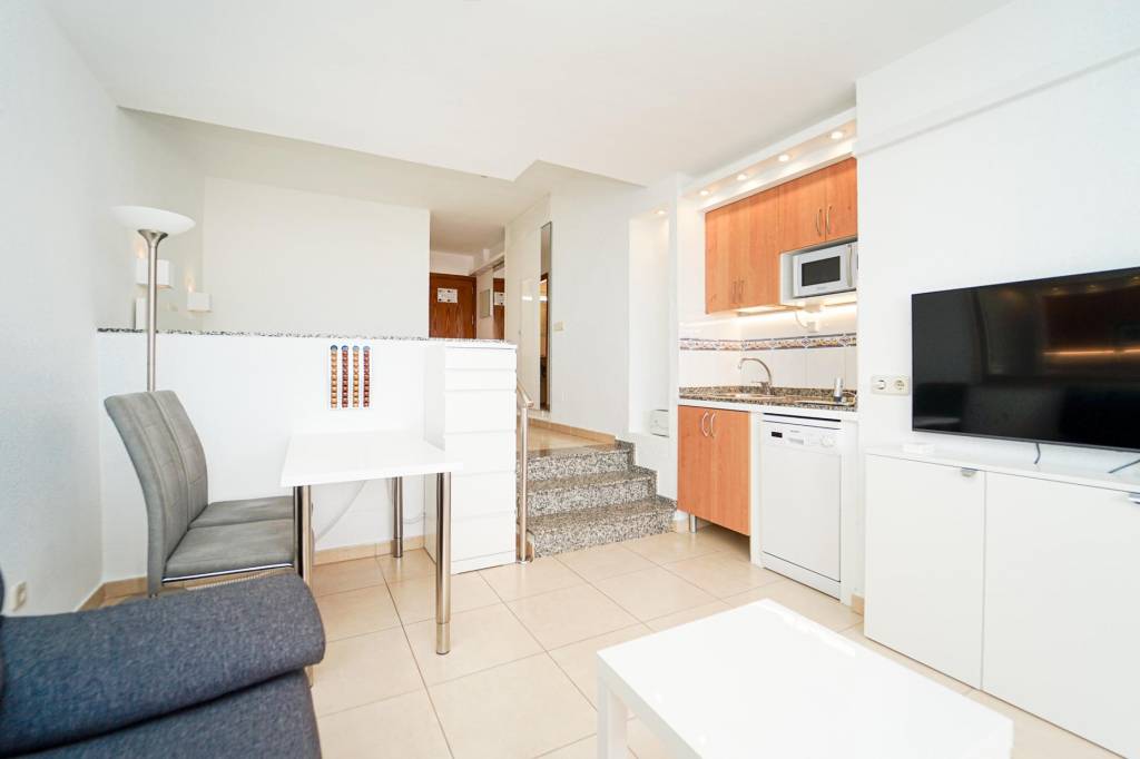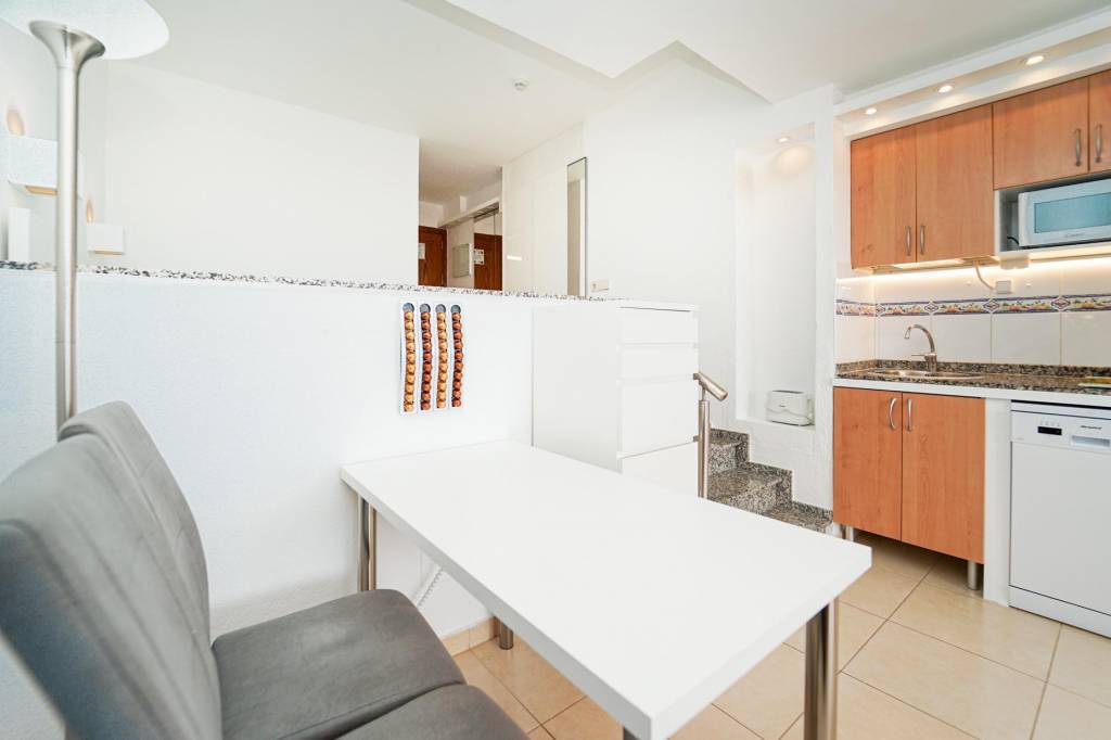Este acogedor estudio ha sido mejorado en los últimos años, ofreciendo una iluminación moderna y un aprovechamiento más eficiente de los espacios, creando un ambiente cómodo y funcional. La cocina está equipada con lavavajillas, y se ha instalado una práctica barra en la terraza para que disfrutes aún más de las vistas al mar.