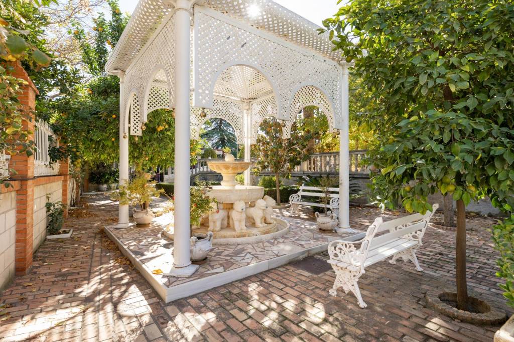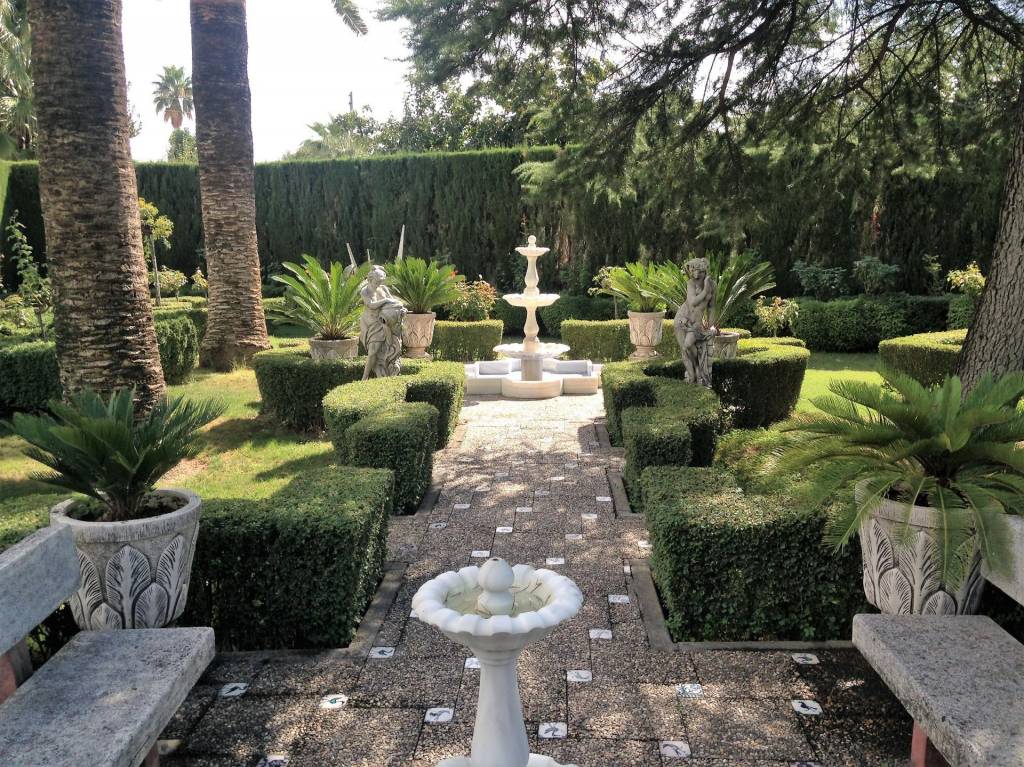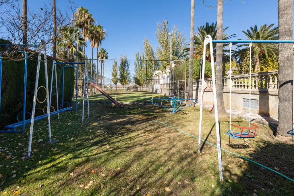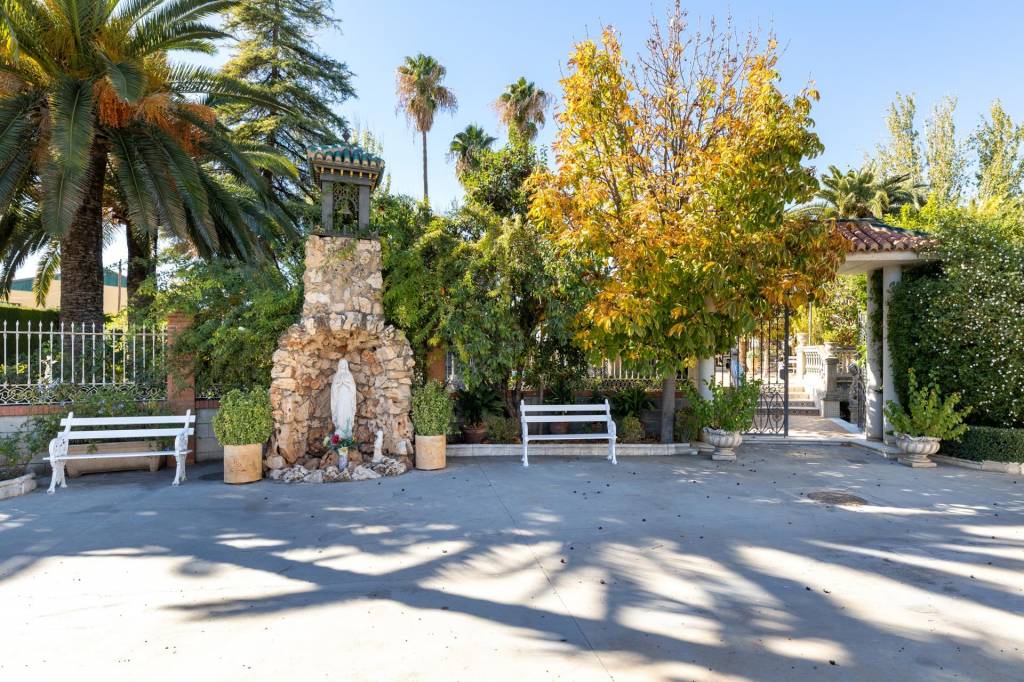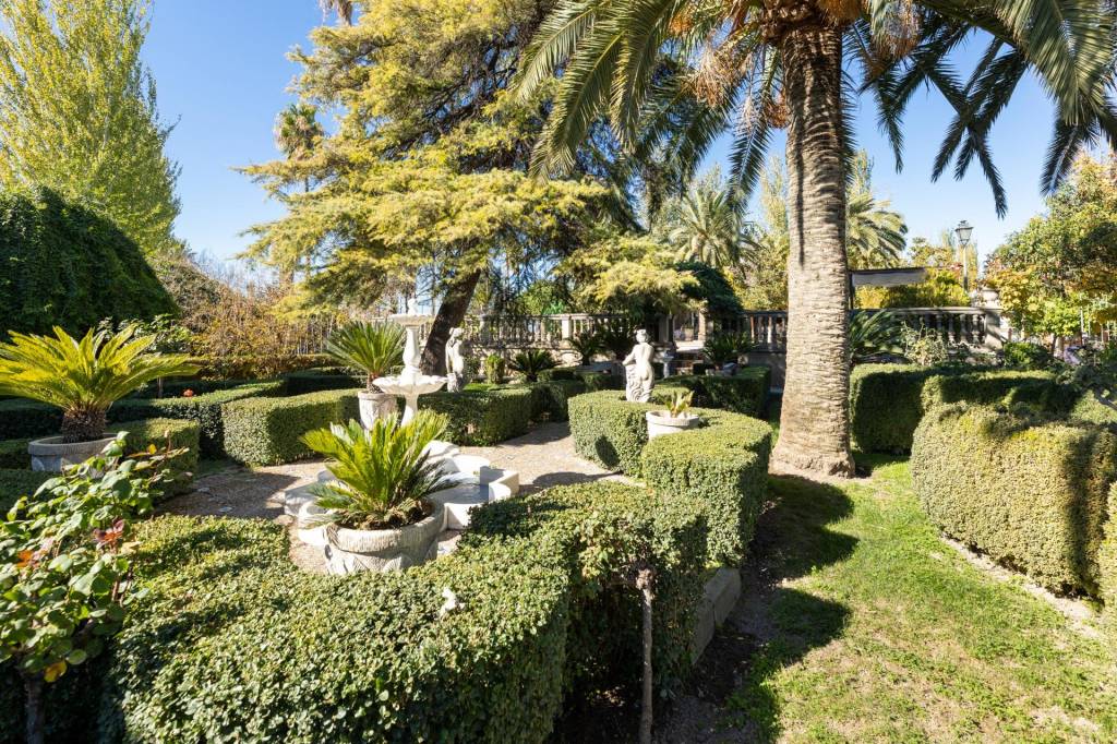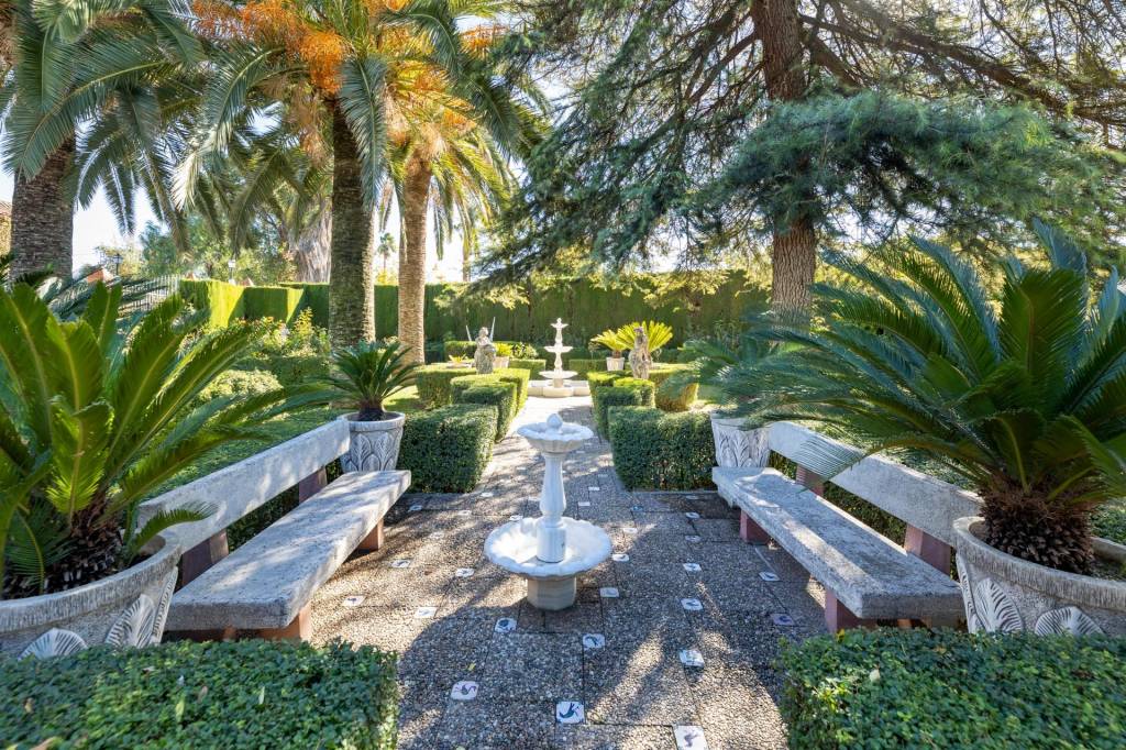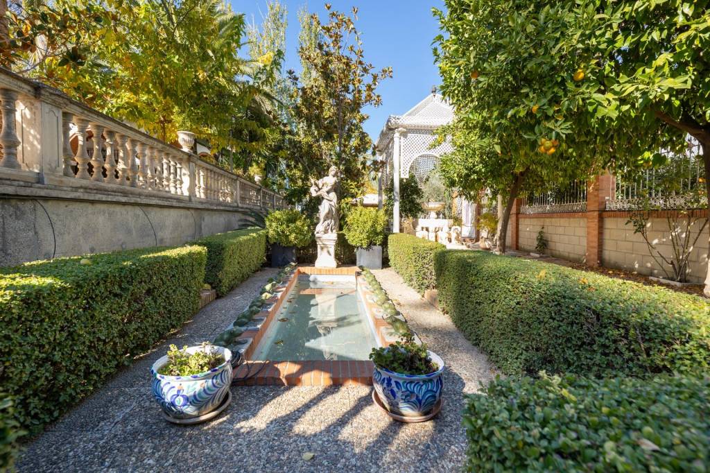 Encontraremos amplios jardines de estilo árabe, con estatuas y bancos de piedra, fuentes y cascadas. Todo ello en perfecto estado de conservación y con riego automático. Por si todo ello fuera poco, la piscina se está renovando completamente, y el afortunado comprador de este inmueble podrá disfrutarla y estrenarla próximamente.