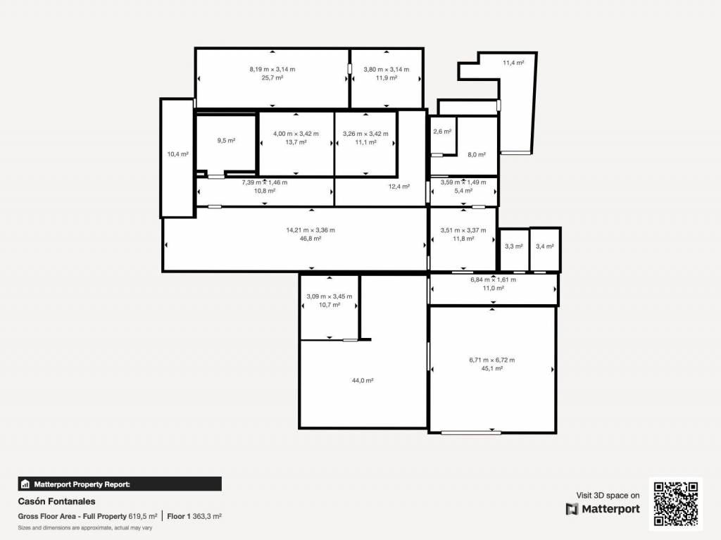 La finca cuenta con una extensión total de 5.845 m², de los cuales 504 m² corresponden a la edificación principal, actualmente registrada. El resto del espacio alberga alpendres, cuartos de aperos, un estanque, zonas exteriores y espacios abiertos, todo con acceso rodado y garaje.