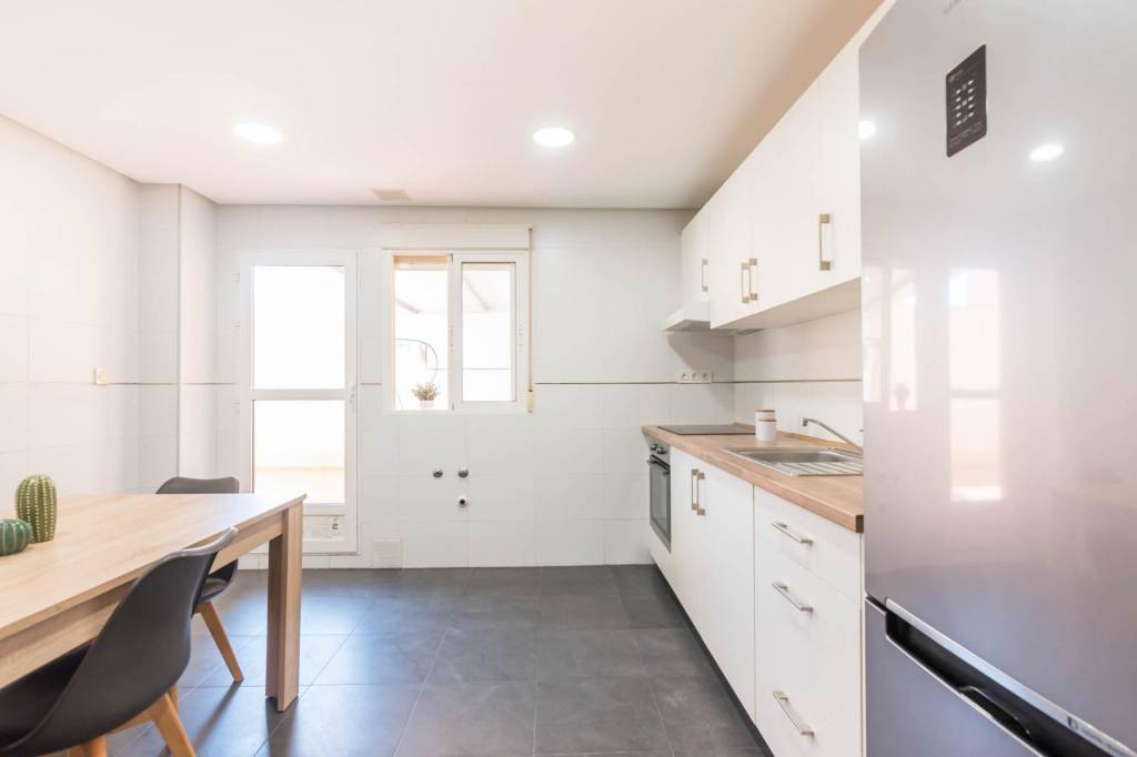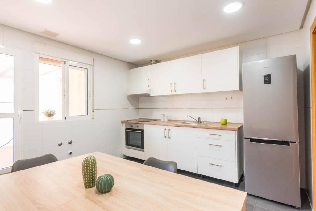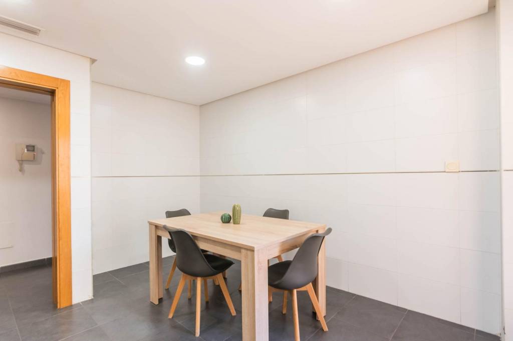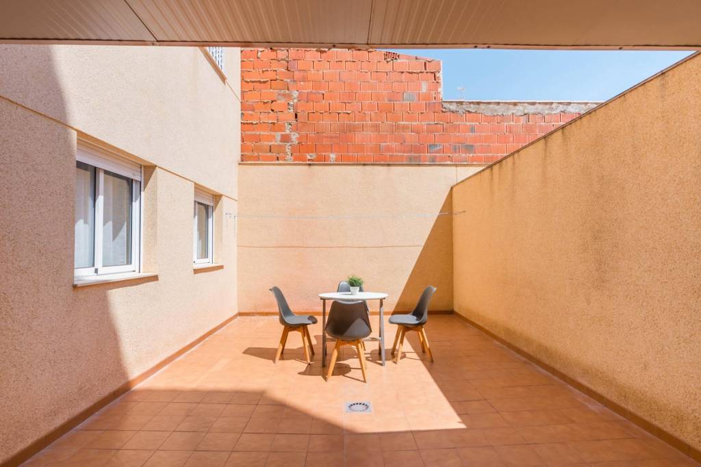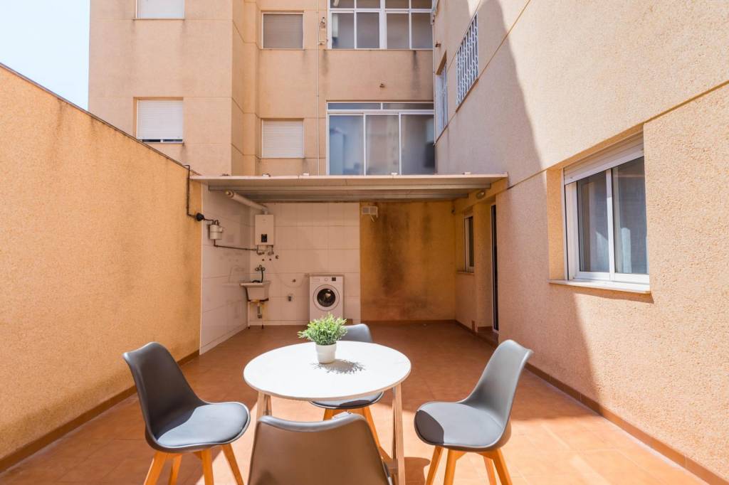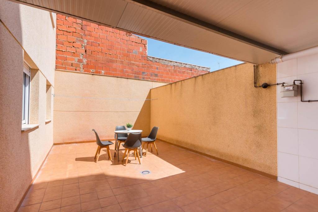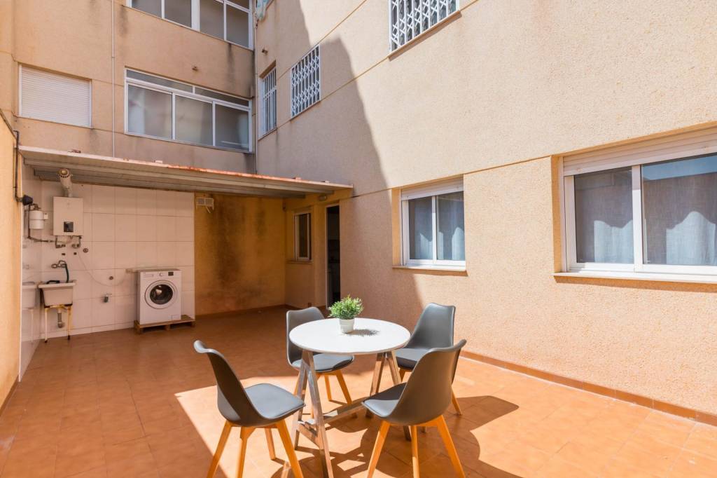 Está compuesto por tres amplias habitaciones, dos cuartos de baño, salón, cocina independiente equipada y por la cual se accede al amplio patio de 32 m del cual dispone del uso y disfrute y donde podrás pasar fantásticos momentos en compañía de los tuyos. También tiene una plaza de garaje y un trastero.