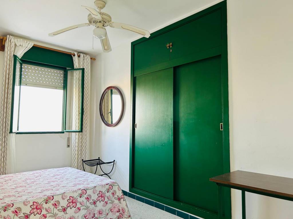 La habitación principal cuenta con ventilador en el techo y con armario empotrado y ventana con vistas al mar.