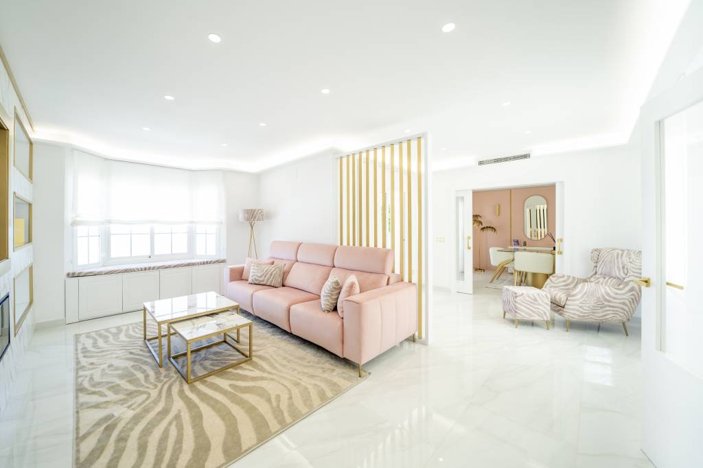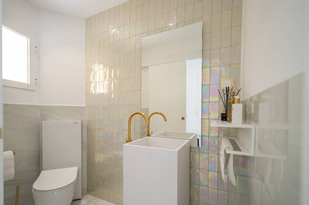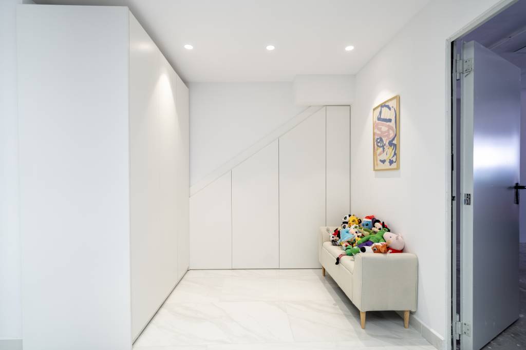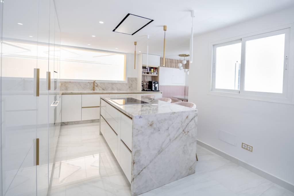 En la planta principal (98m2 construidos), se accede a través de un encantador patio privado que conduce a un recibidor. A la derecha, se encuentra la cocina americana totalmente equipada con isla central, un comedor de diseño a medida y un salón amplio y luminoso con salida directa a una terraza soleada, perfecta para desayunos al aire libre o cenas al atardecer. A la izquierda, hay una escalera moderna con iluminación futurista que comunica con las plantas inferiores, así como un aseo de cortesía.