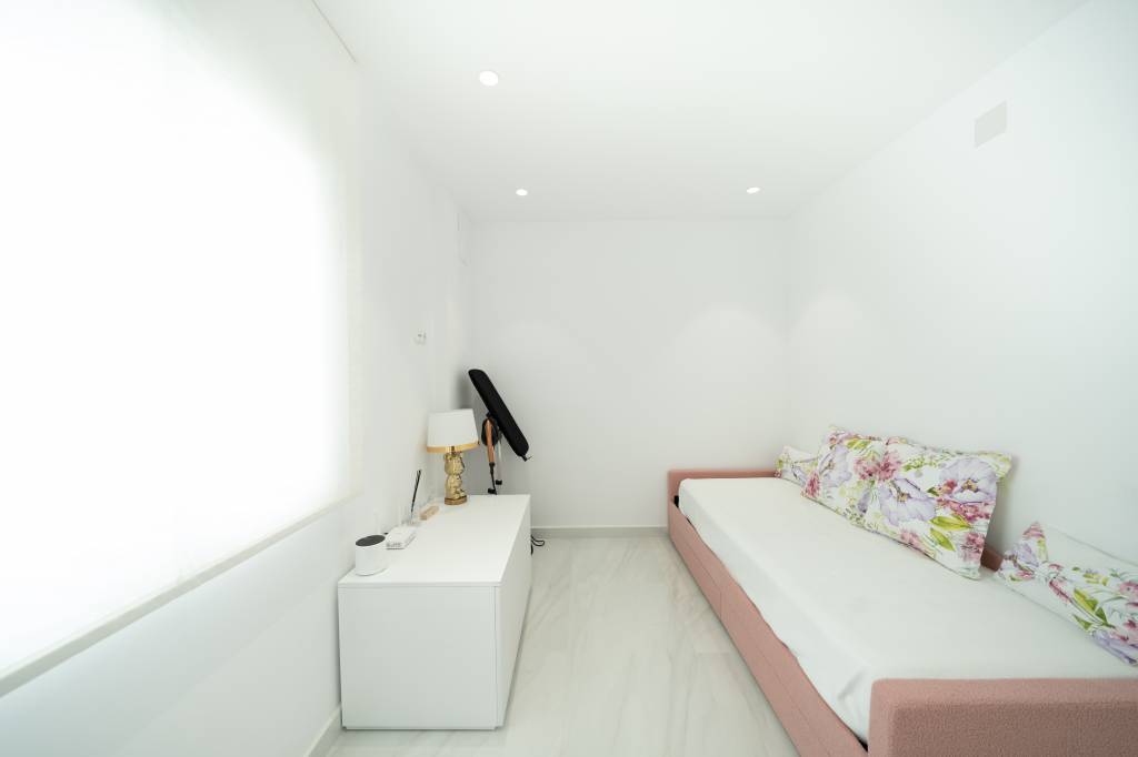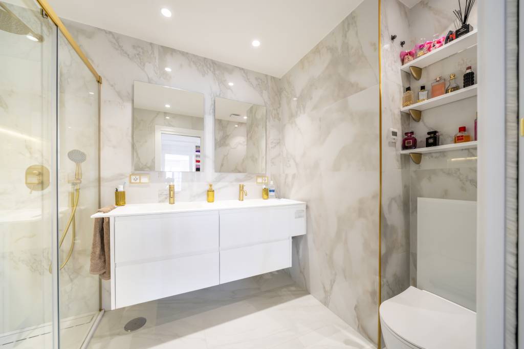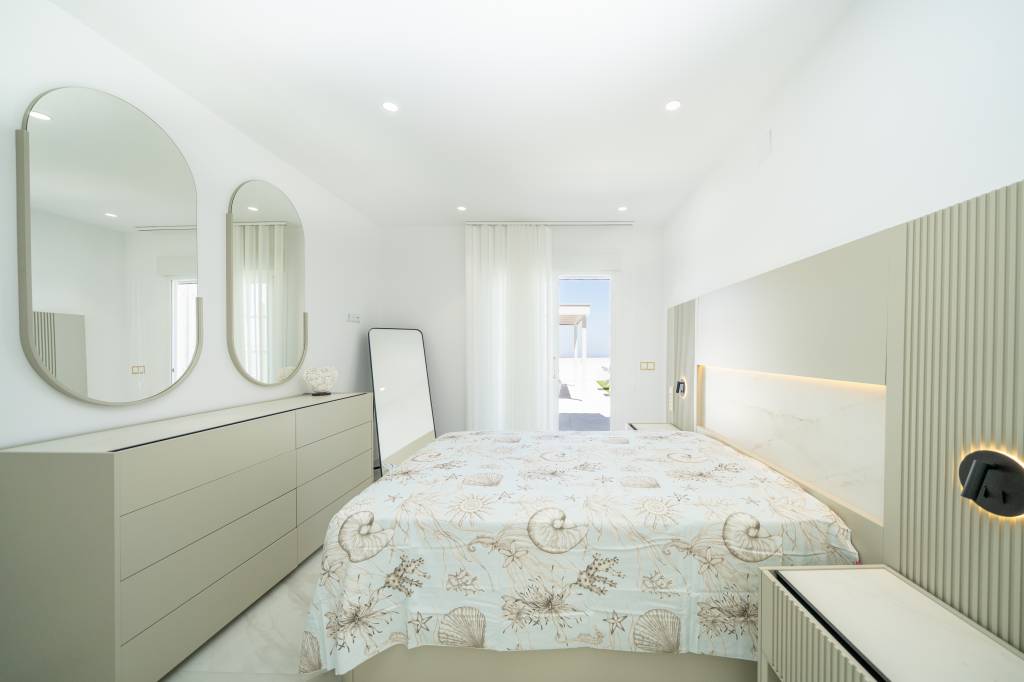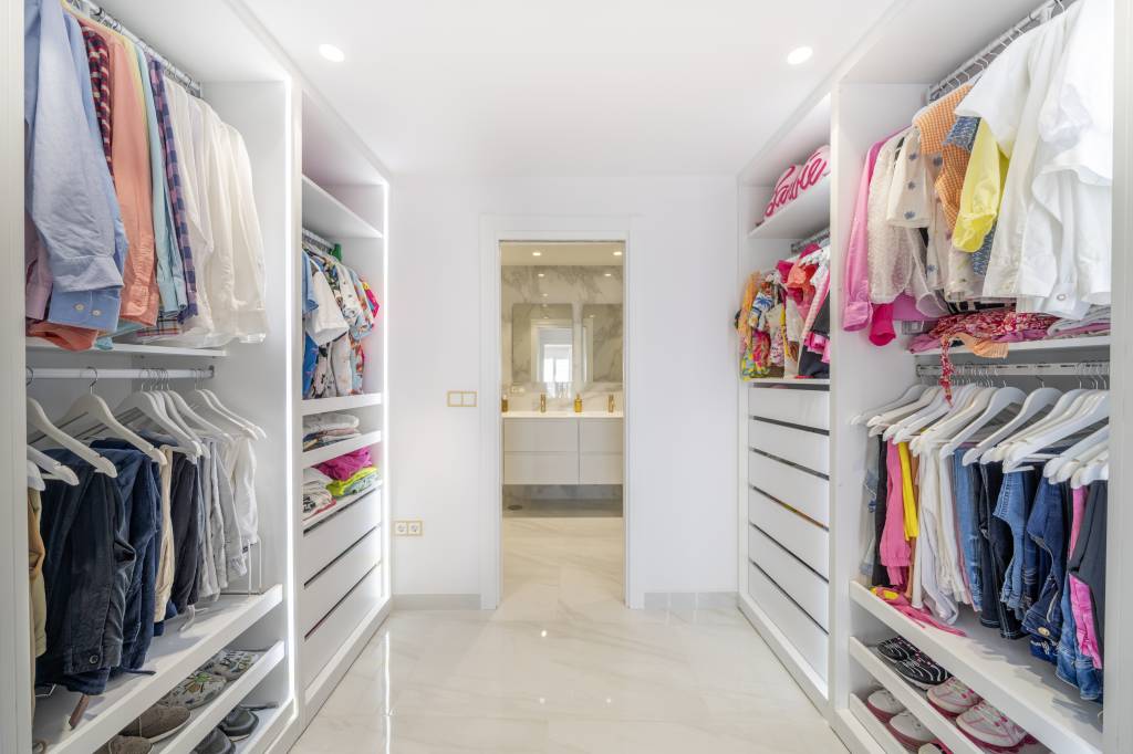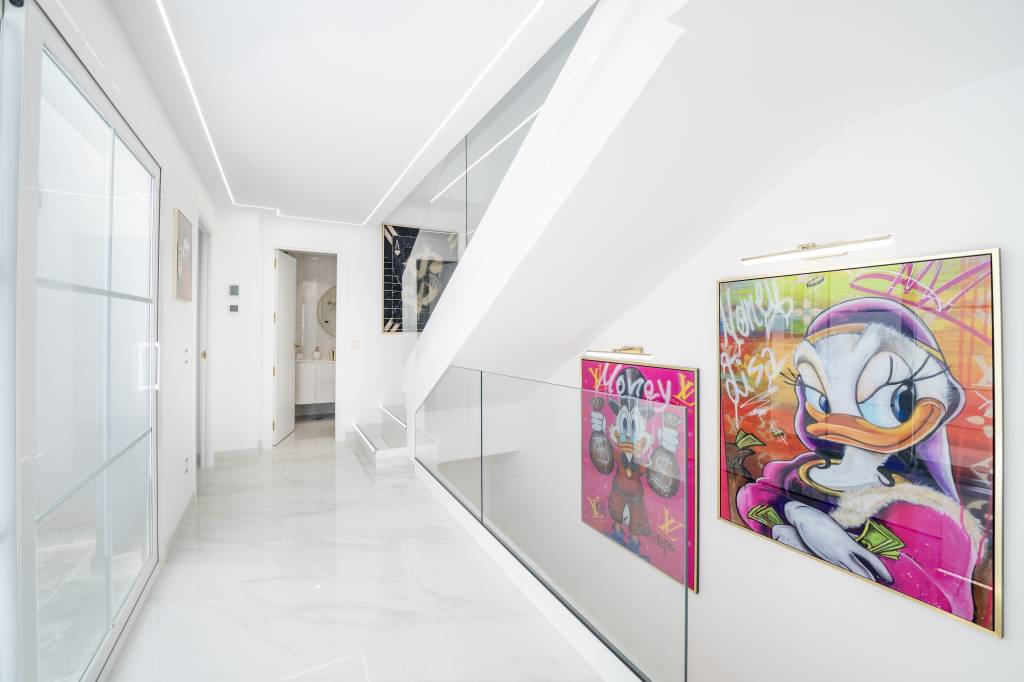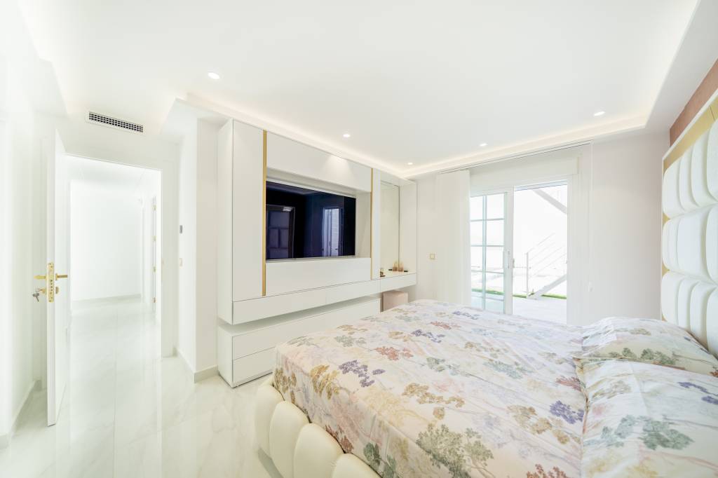 La planta inferior (111m2 construidos) está dedicada al descanso y la tranquilidad, y dispone de cuatro dormitorios, incluido un dormitorio principal en suite con vestidor y baño privado. Un segundo baño completo da servicio al resto de habitaciones. Tres de los dormitorios tienen salida directa a la terraza principal, donde se encuentra una espectacular piscina climatizada de agua salada tipo infinity, equipada con persianas automáticas de seguridad para mayor tranquilidad. Esta zona exterior también ofrece una cocina de verano completamente equipada y un espacio chill-out cubierto, perfecto para relajarse y disfrutar de las impresionantes vistas.