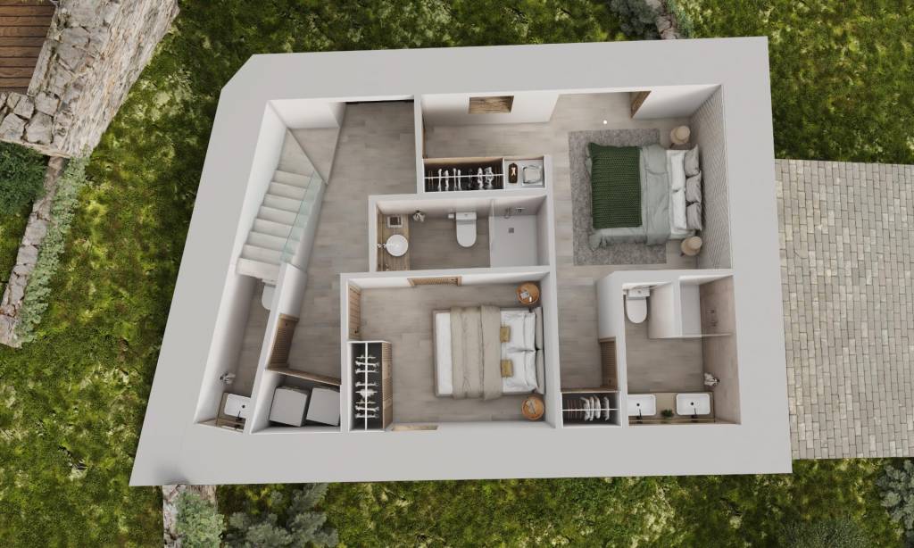 La borda dispone de tres dormitorios amplios y luminosos, pensados para ofrecer descanso y privacidad. Dos baños completos equipados con materiales de primera calidad aportan funcionalidad y diseño. La distribución ha sido estudiada para aprovechar cada metro cuadrado, con zonas de almacenaje y circulaciones cómodas, consiguiendo una vivienda práctica para vivir todo el año o disfrutarla como segunda residencia.