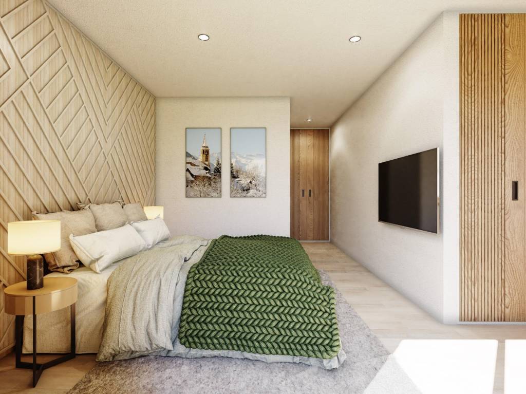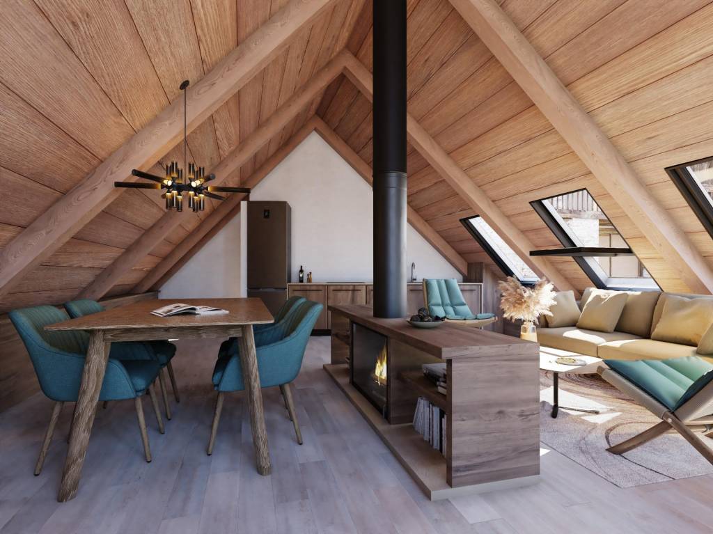 El proyecto ha respetado al máximo la esencia de las bordas pirenaicas: fachadas de piedra y madera natural, cubiertas inclinadas y proporciones armoniosas con el entorno. Al entrar en la vivienda, uno se encuentra con un gran espacio abierto donde se integran la cocina y el salón. La cocina, moderna y funcional, se ha diseñado para convivir con la vida social del hogar: isla central, electrodomésticos integrados y acabados de calidad. El salón, con sus techos altos abuhardillados revestidos en madera, transmite una calidez especial; las vigas vistas y la luz natural que entra por los ventanales crean un ambiente acogedor durante todo el año, ideal para tardes de chimenea o reuniones familiares tras una jornada de montaña.