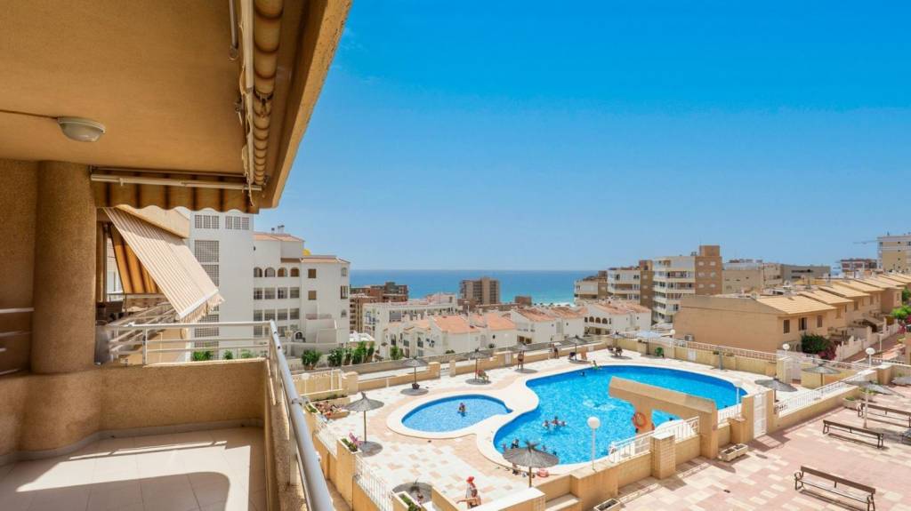 Piso de 2 dormitorios, con terraza, piscina comunitaria, parking y vistas laterales al mar en Arenales del Sol.