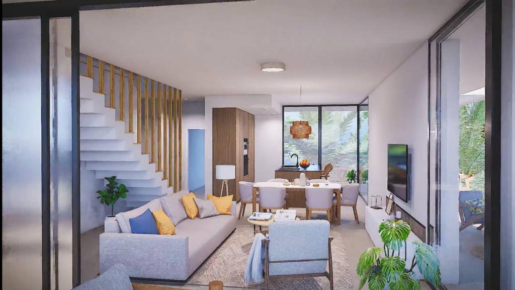 Los apartamentos tienen un diseño moderno, presentando una zona de estar de planta abierta, que combina la cocina, el comedor y el salón, en un gran espacio con acceso a la terraza.