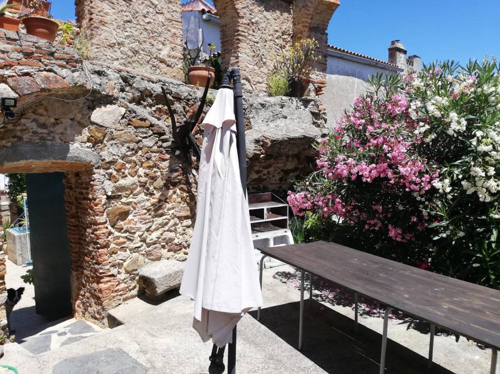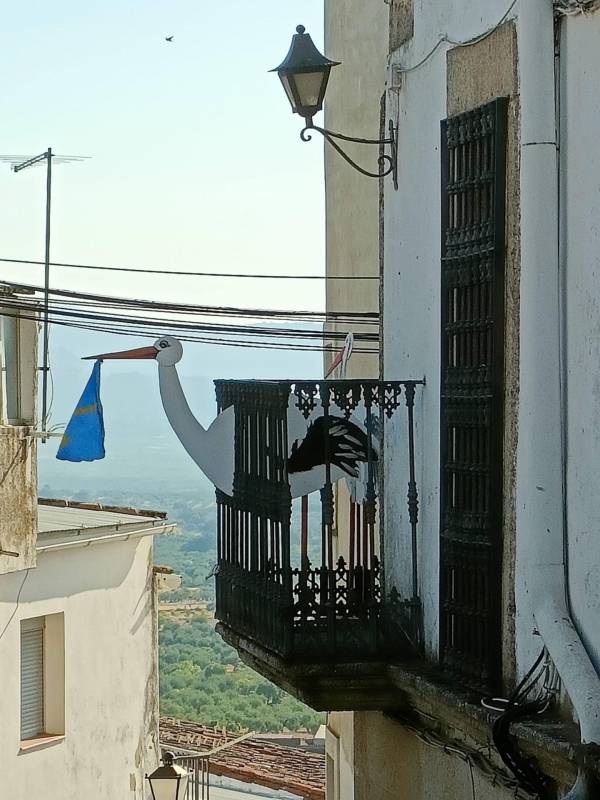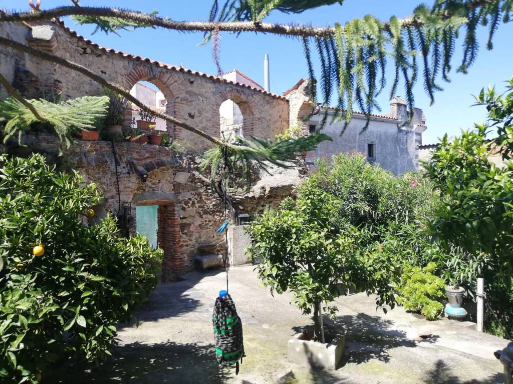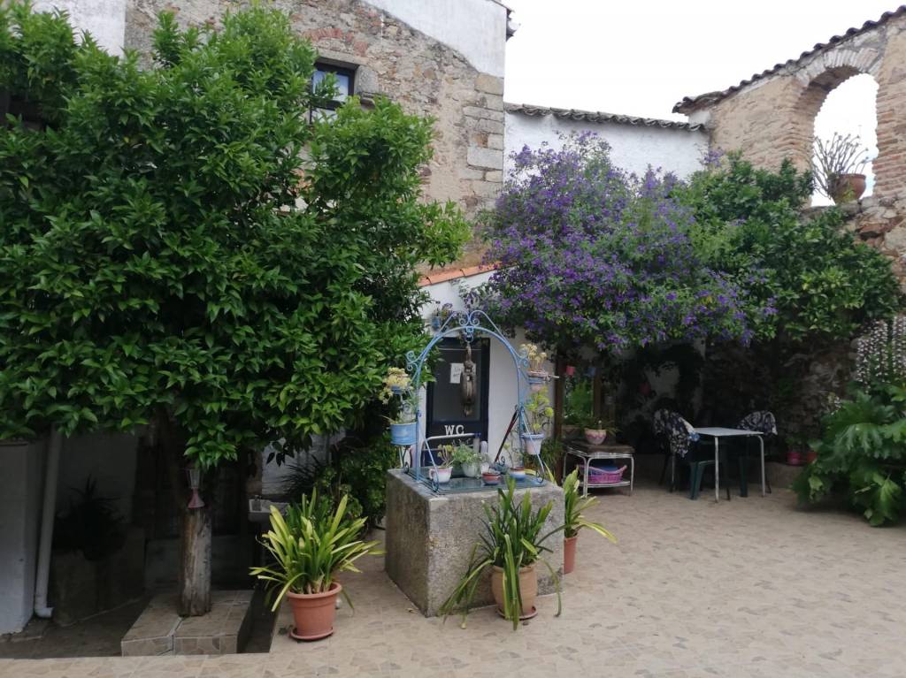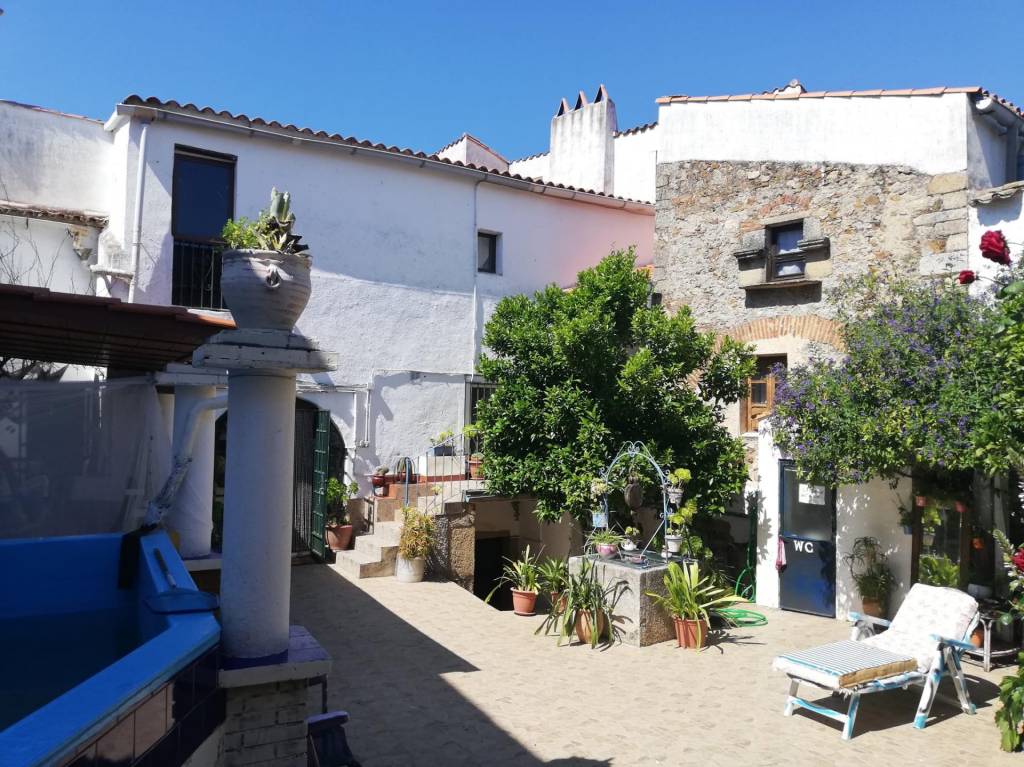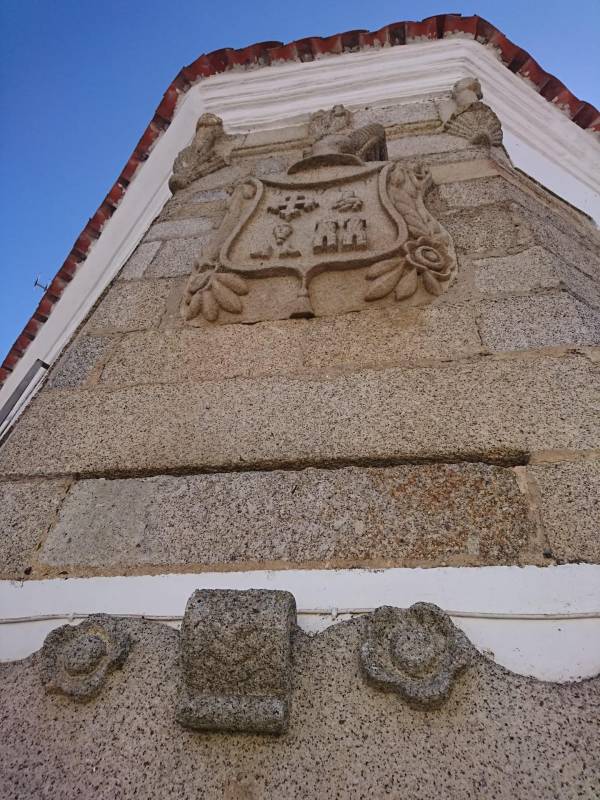 Muros de carga gruesos con piedra vista en planta baja y fachada encalada el resto, disfruta de 4 balcones (1 en esquina) con rejas antiguas de forja, en la parte superior de este último aparece un escudo labrado típico de casas solariegas extremeñas de familias con cierta posición social, estructura horizontal con bóvedas de medio punto y cubierta inclinada de teja cerámica, completamente rehabilitada.
