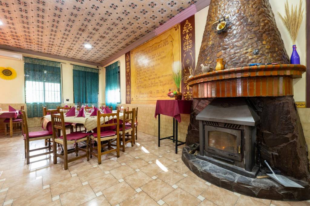 Ambiente Castellano/Rural: Decoración tradicional con techos artesanales, suelos de gres de alta resistencia y una gran chimenea rústica que preside el salón principal, aportando calidez y carácter.